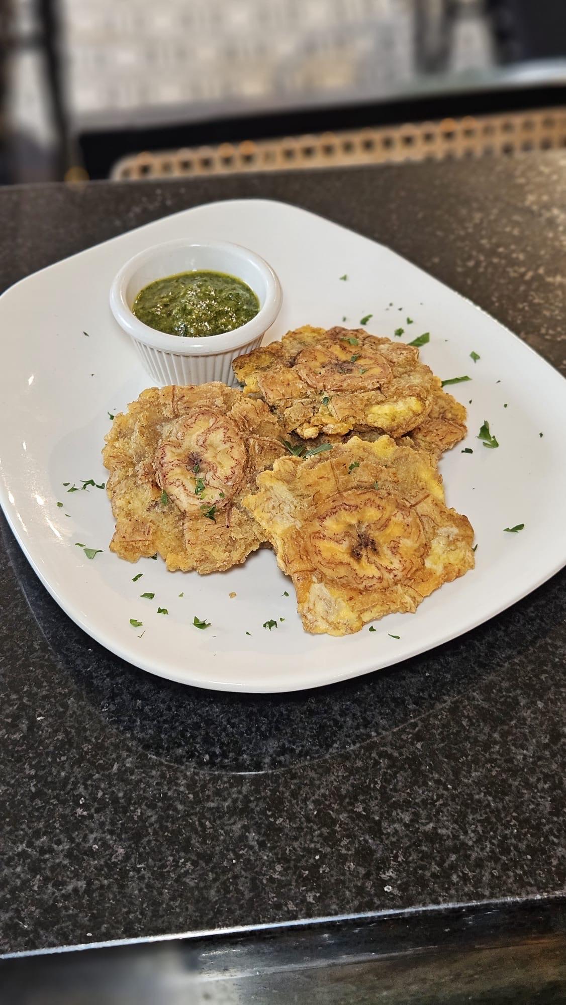 Crispy tostones topped with tangy, herb-packed chimichurri sauce