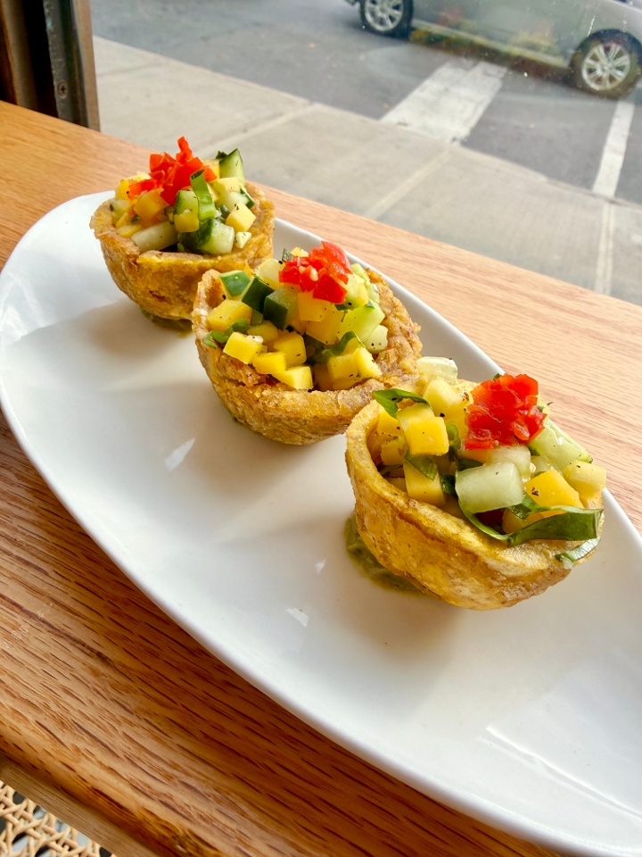 Mango and Cucumber tossed with lemon, Chadon beni, Garlic, Salt and Pepper in a crispy plantain cup