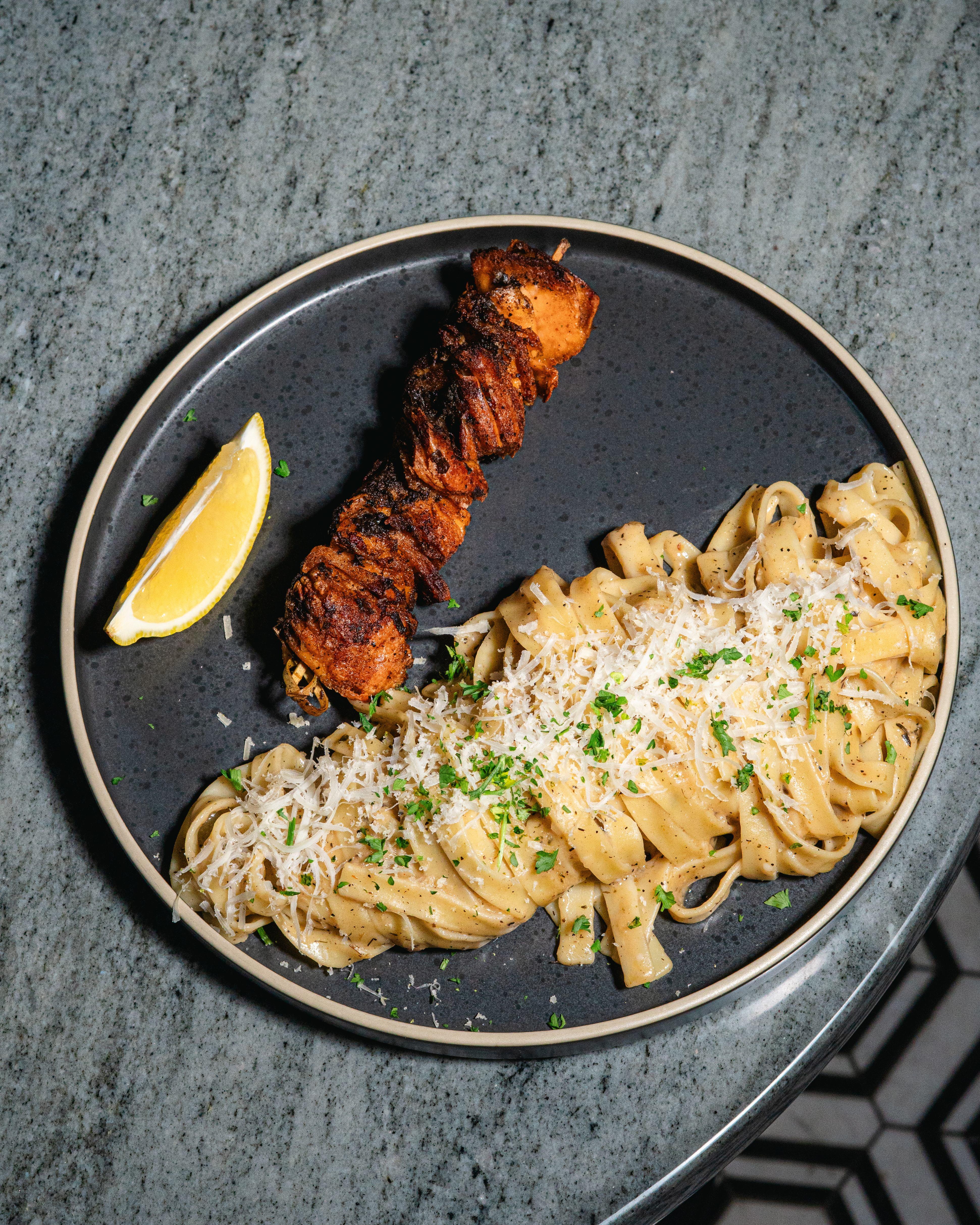 Jerk spiced salmon over fettuccine in creamy island alfredo sauce