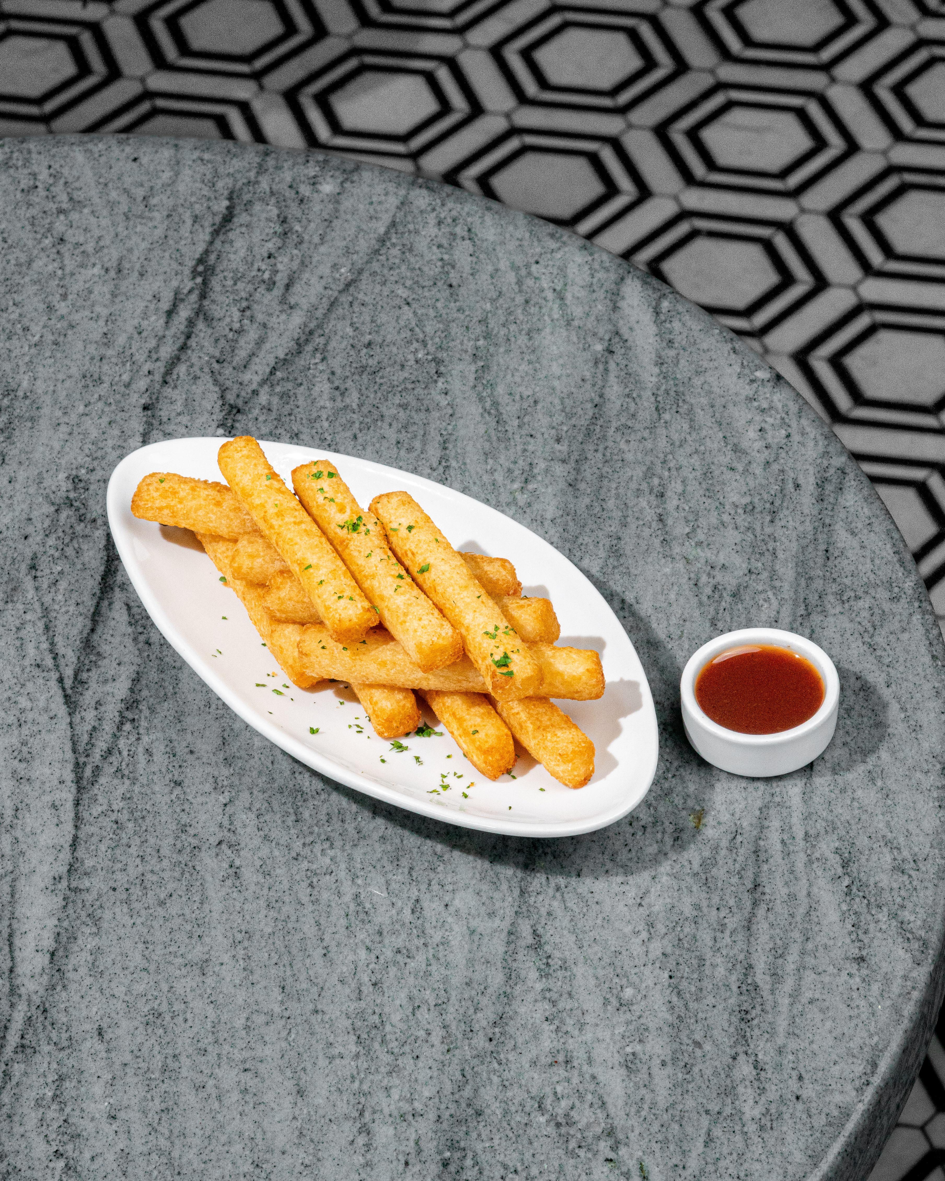 Crispy yucca fries served with smoky tangy BBQ sauce