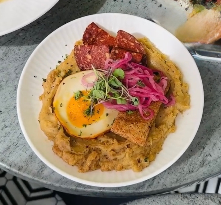 Mashed green plantains with salami, tofu queso frito, cebollitas and a sunnyside up egg