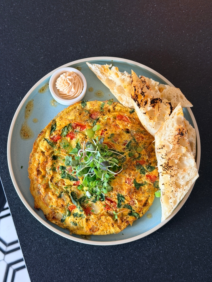 Omelet with pimento peppers, curried sweet onions, spinach and tomatoes drizzled with scotch bonnet oil. Served with a French Baguette toast & a guava lime butter