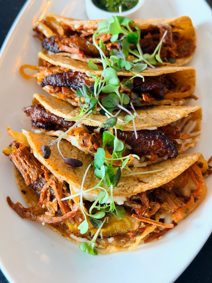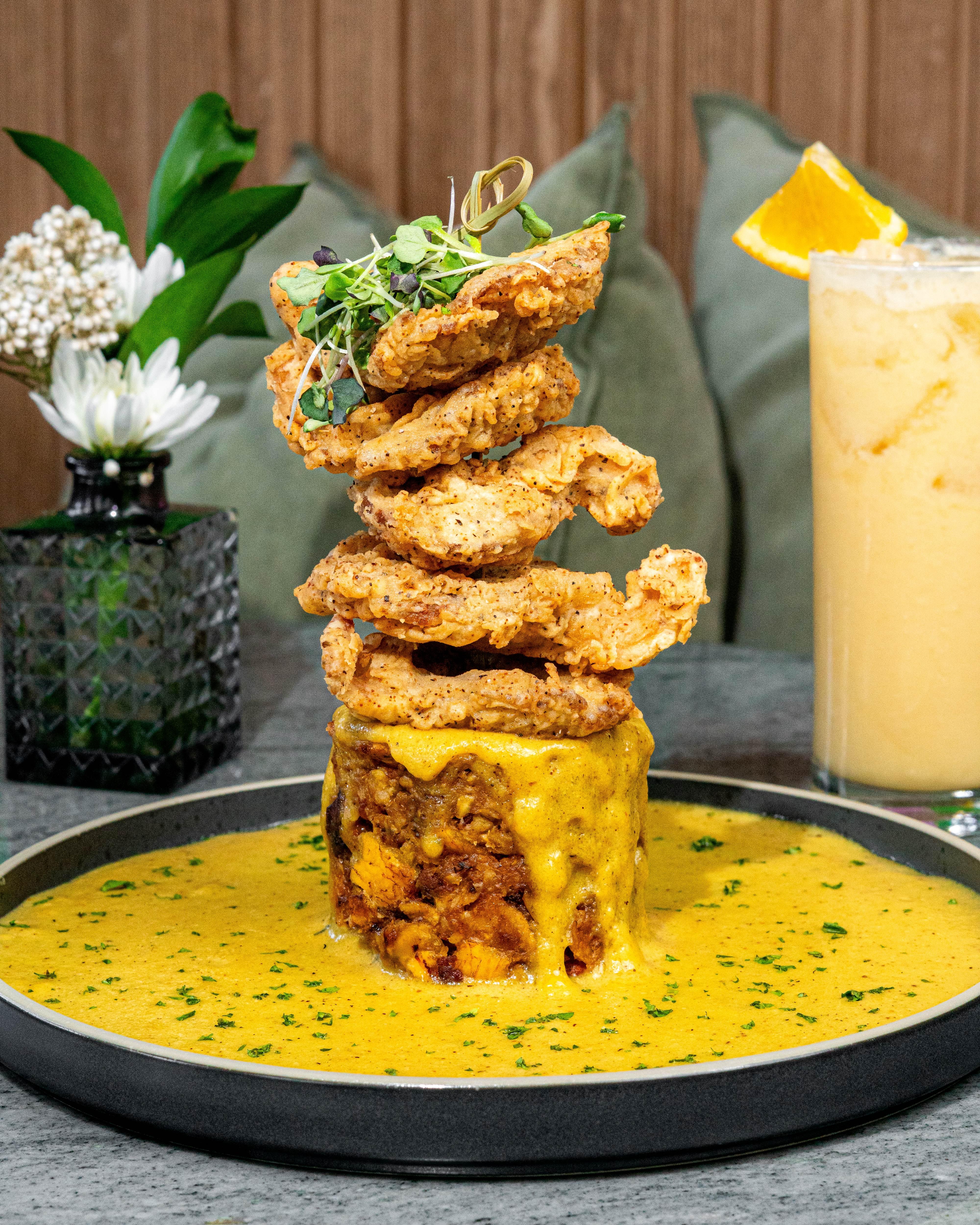 Mofongo made with green and sweet plantains, tempeh bacon, oyster mushrooms drizzled with our curried cream sauce.