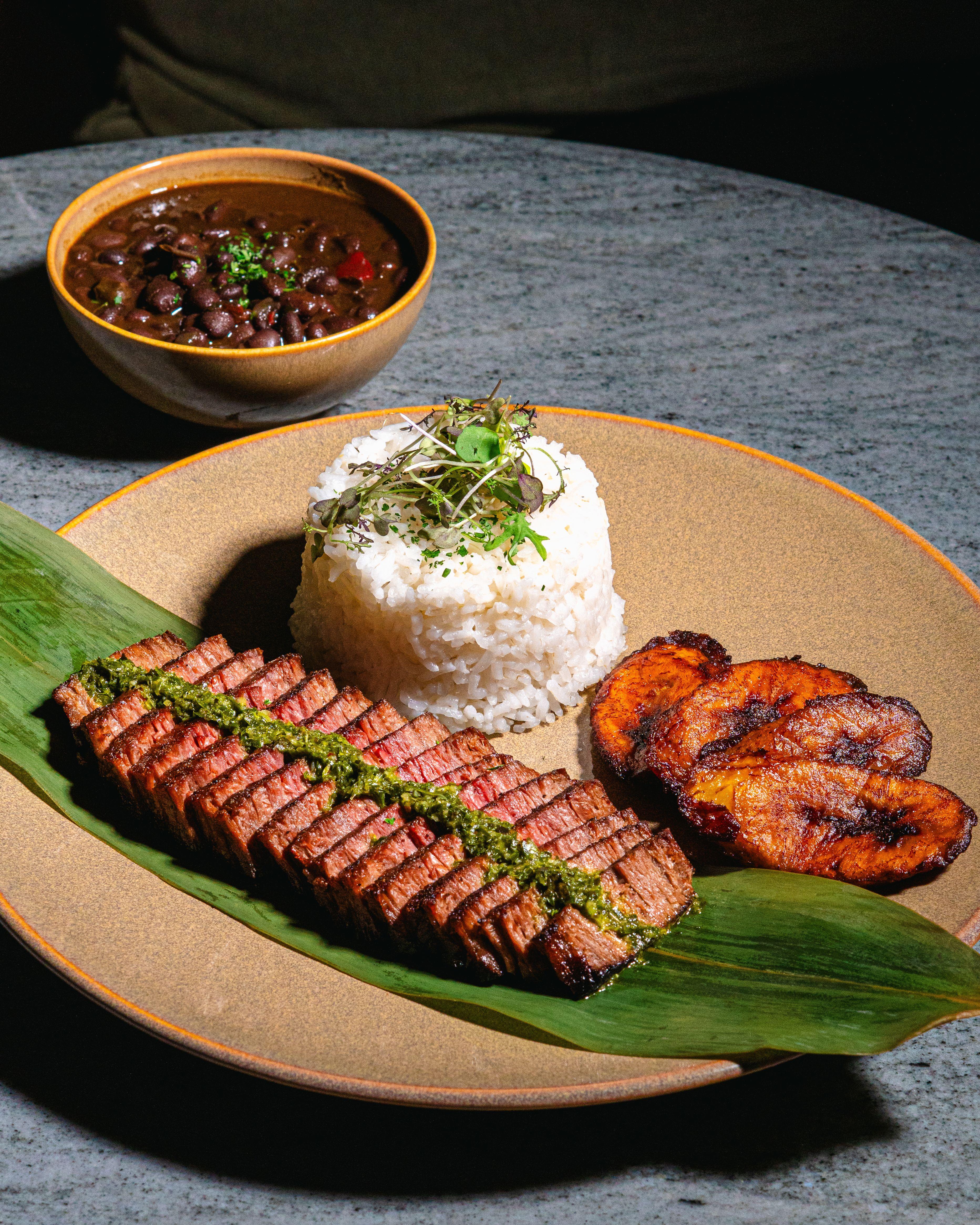 Seared steak with garlic white rice, black beans, maduros, & chimichurri
