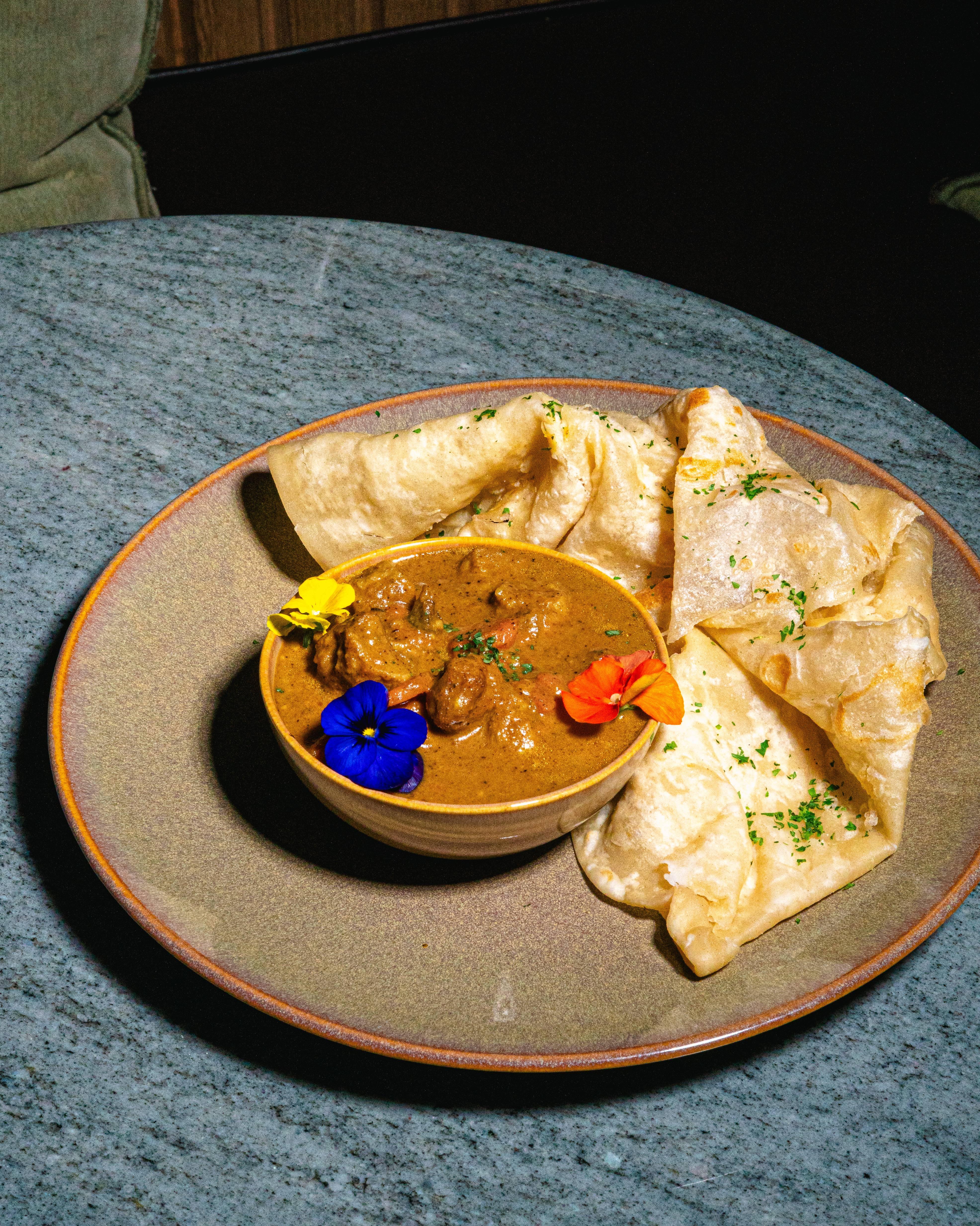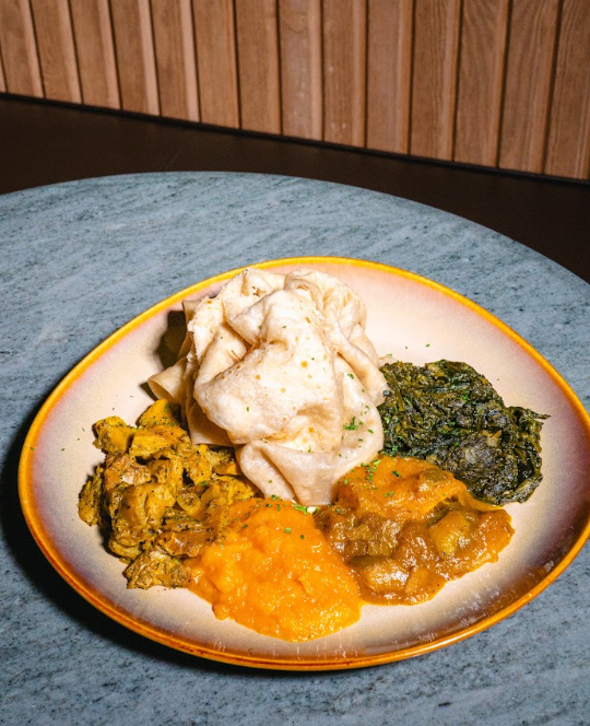 Freshly made tender and flaky roti served with pumpkin, velvety spinach, curry chik'n & curry mango