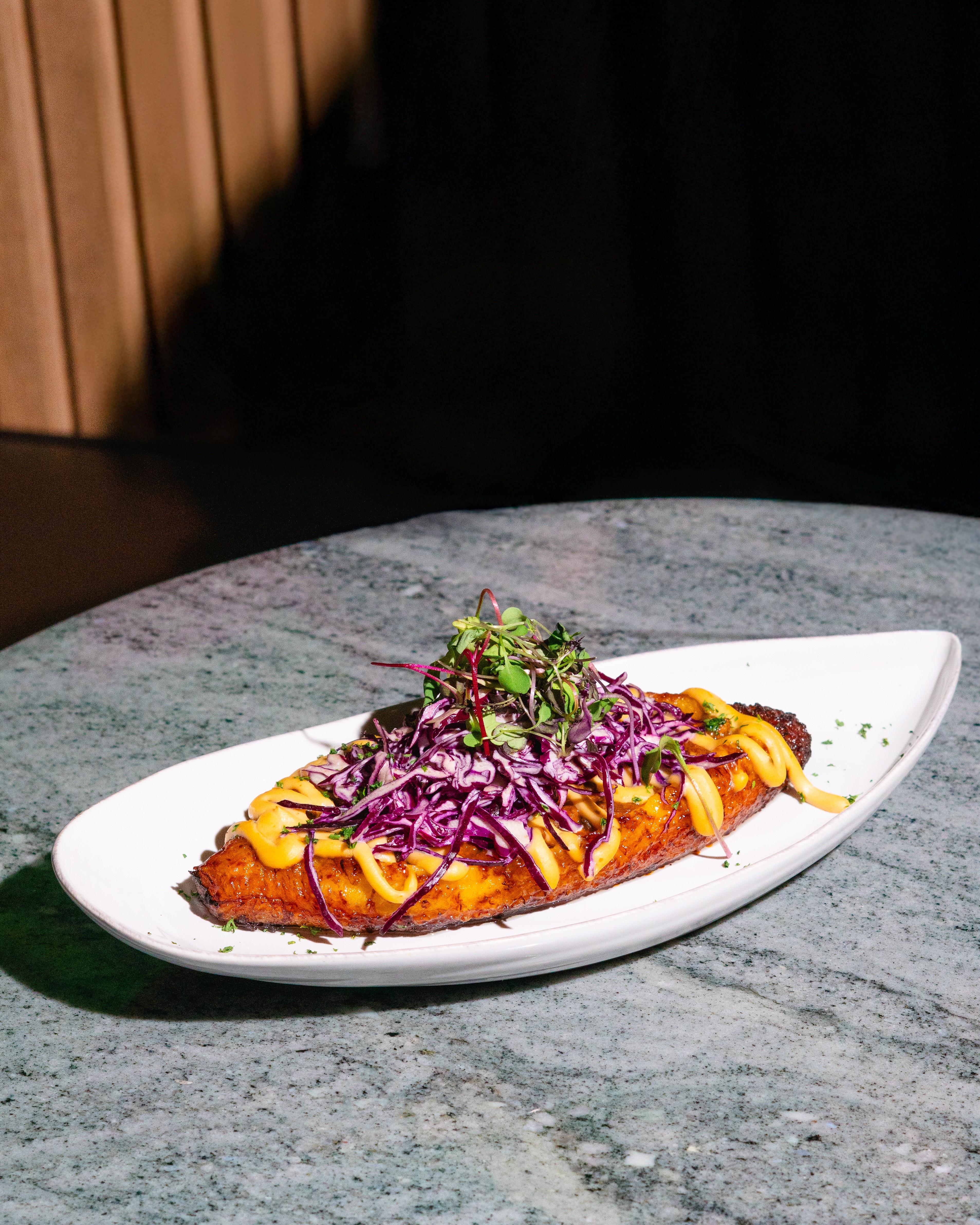 Whole ripe plantain, spiced beef, melted queso, pickled purple slaw, tamarind reduction