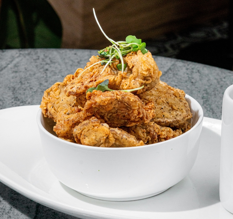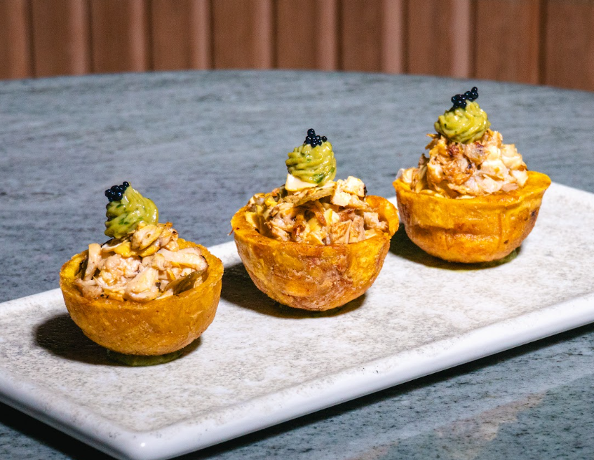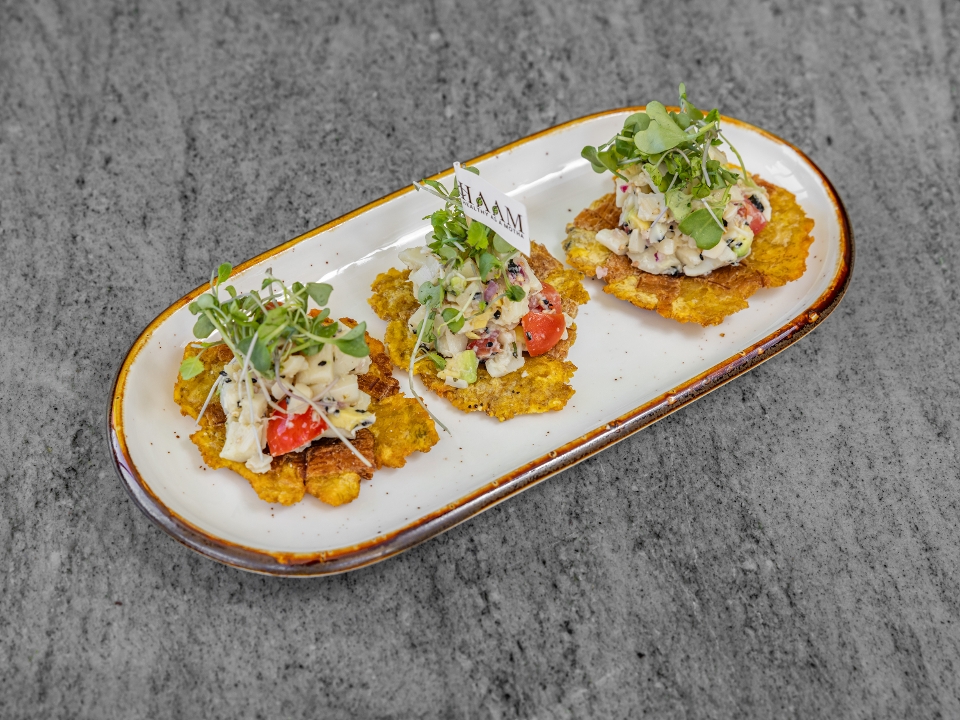 Tender hearts of palm, Served atop a crisp and golden fried plantain.