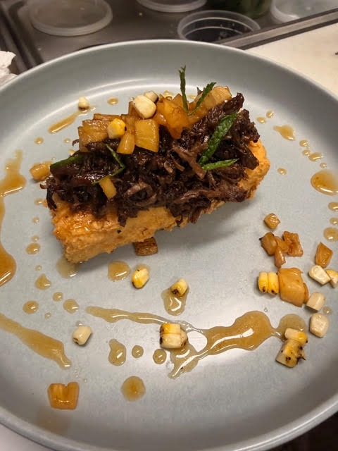 Scotch bonnet honey glazed steak layered over a crisp Caribbean cou-cou, topped with grilled pineapple, charred corn, and fresh mint