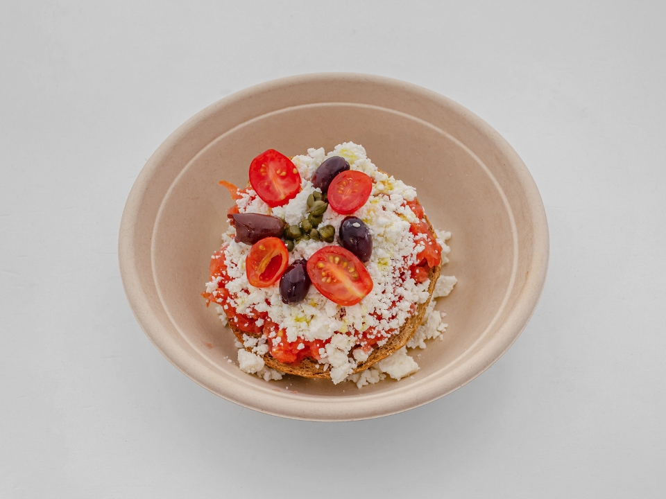 Soften Paksimadi (Greek crouton "Rusk") topped with diced tomatoes, kalamata olives, crumbled feta, oregano & olive oil