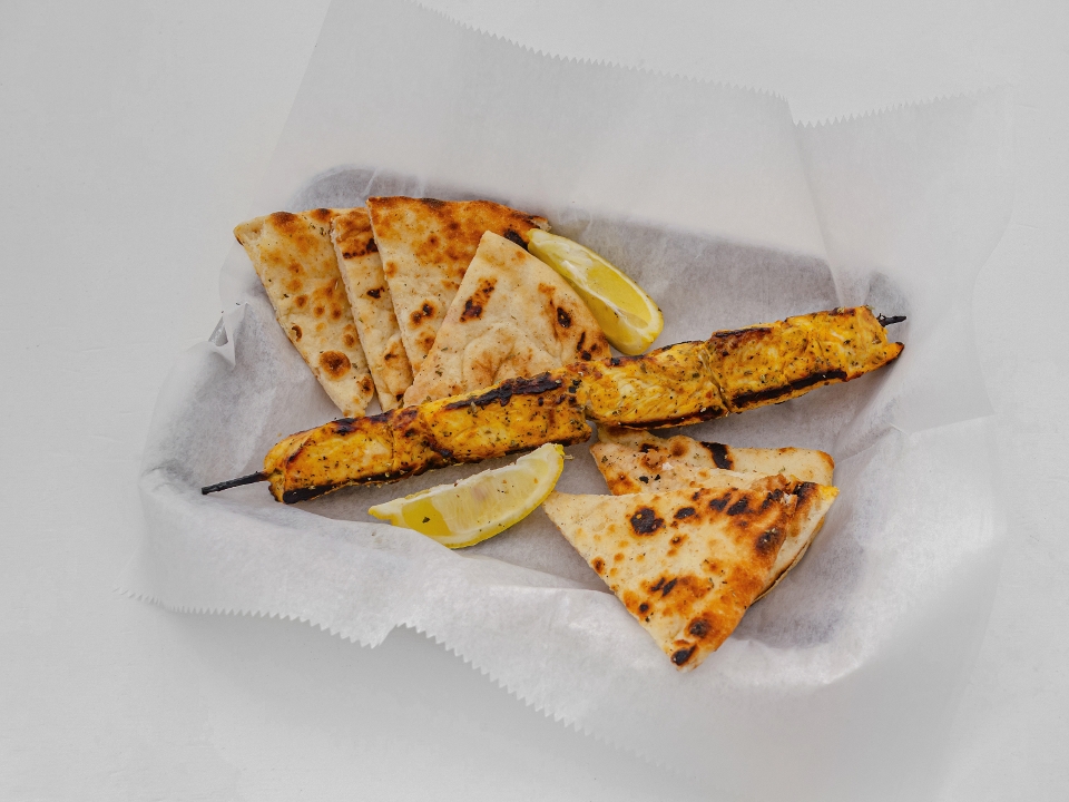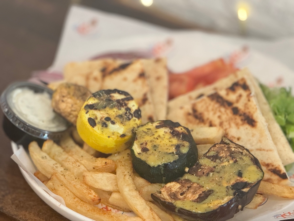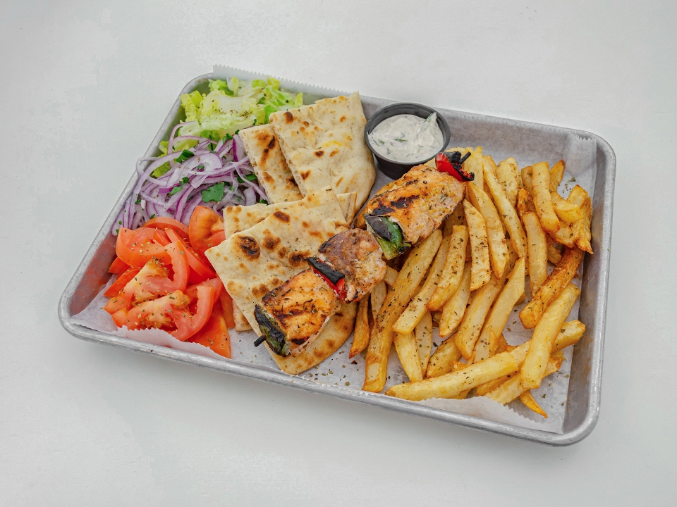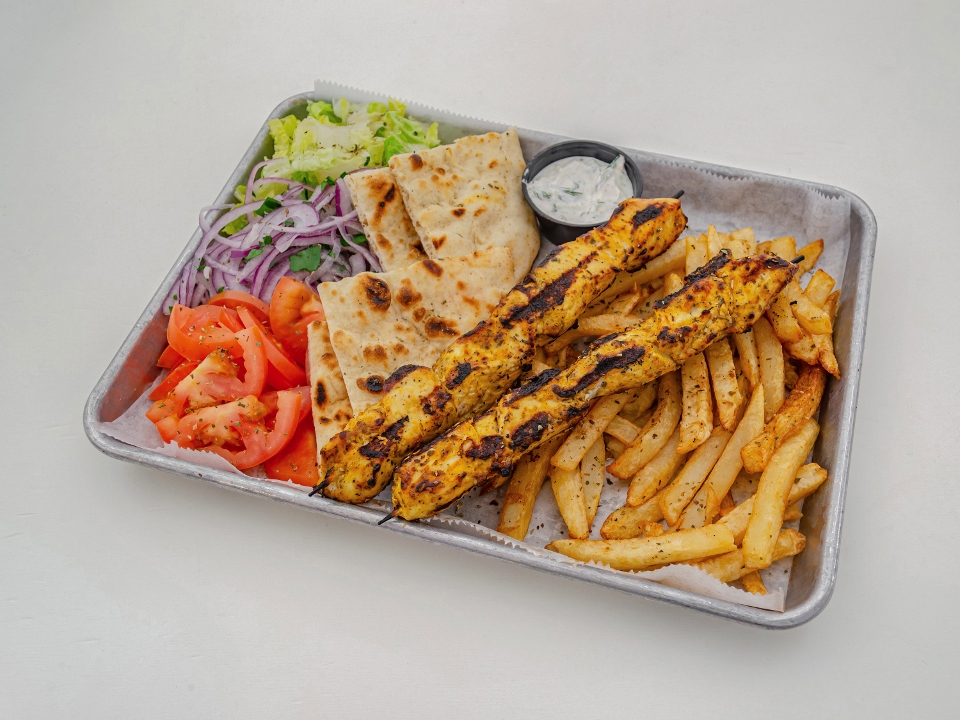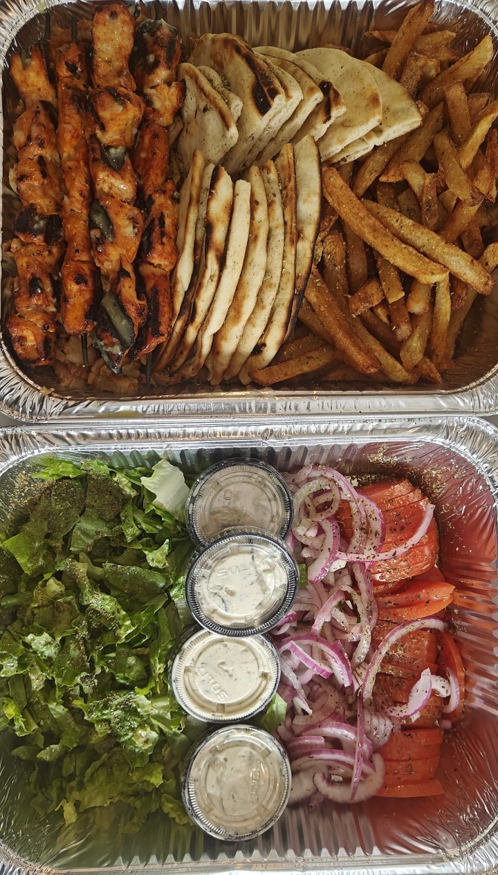 Chicken gyro, 2/4 chicken skewers, pita bread, ya sauce, tomatoes, lettuce and fresh fries