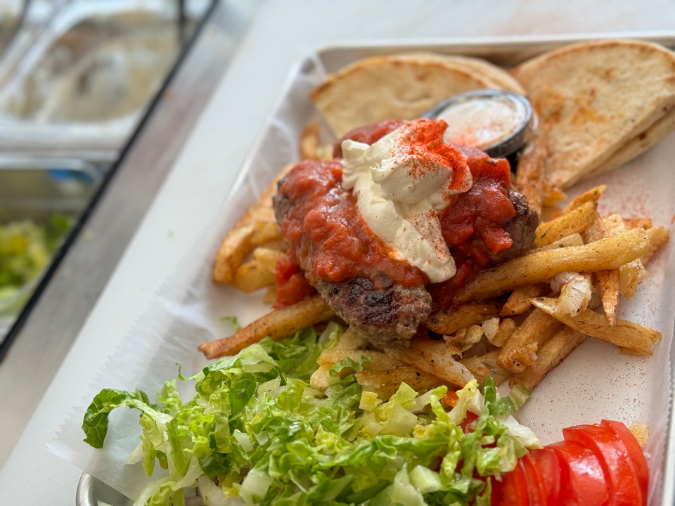 Warm grilled pita bread, grilled kebab then topped with thick, full fat Greek yogurt, a tomato sauce & fries