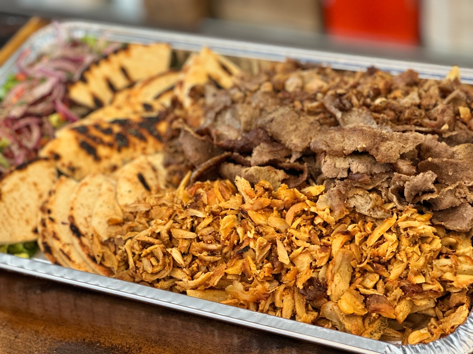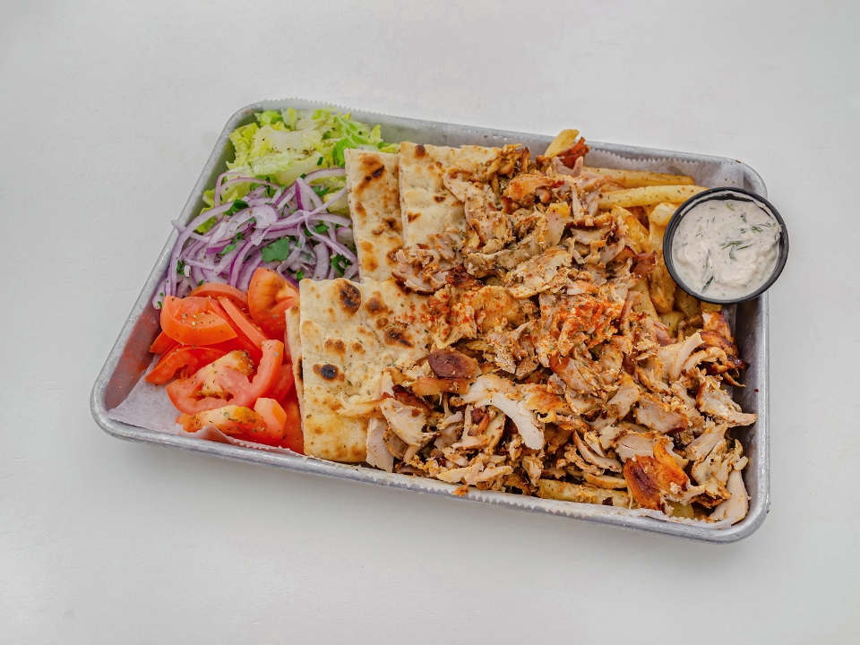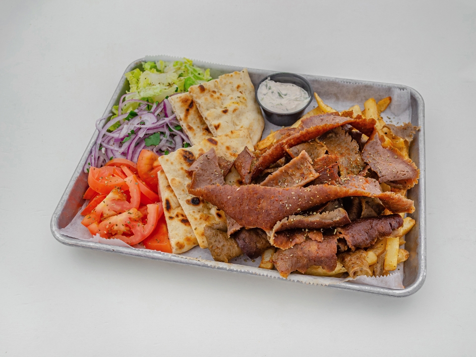 Traditional pork gyro, chicken gyro, beef/lamb gyro & pita bread, tzatziki, tomatoes, onions & fresh fries