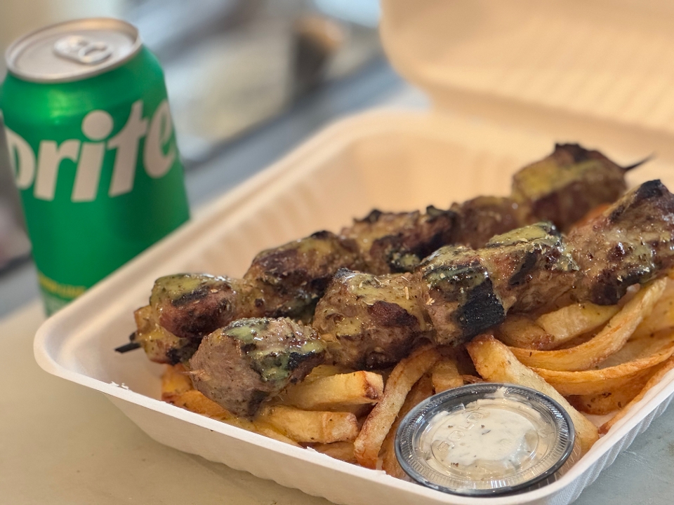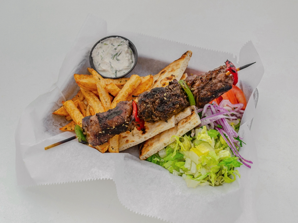 beef-lamb gyro, 2 lamb skewers, 2 skirt steak skewers pita bread, tzatziki and fresh fries