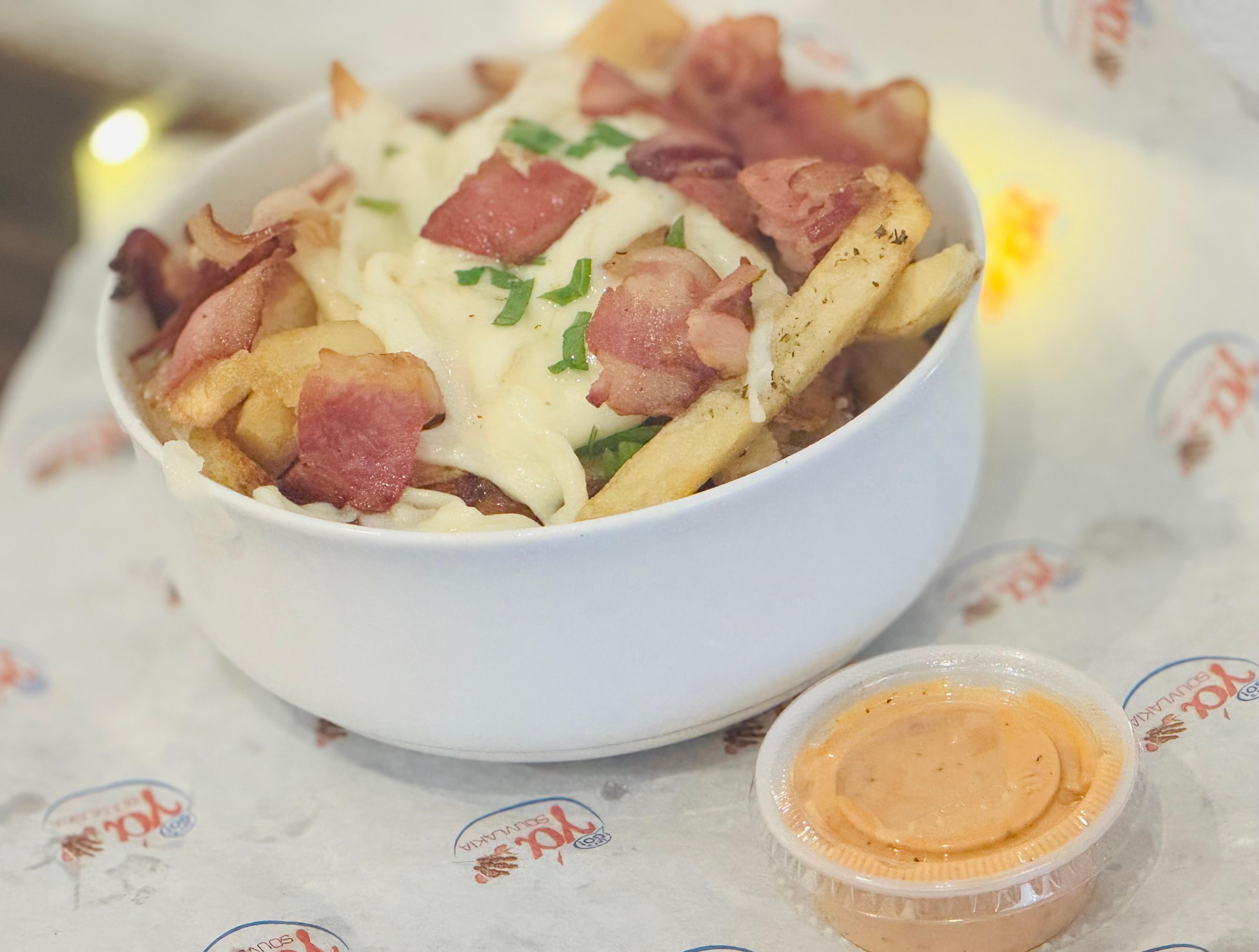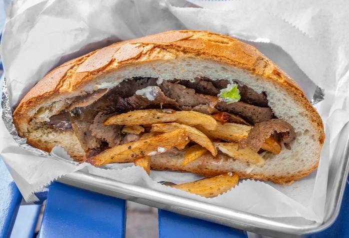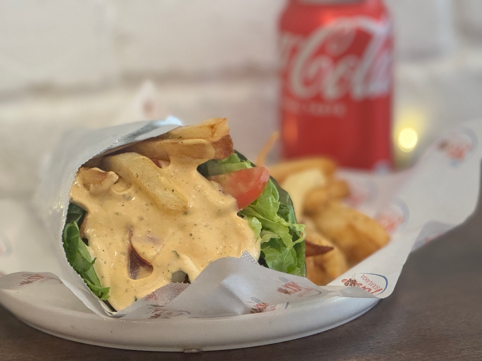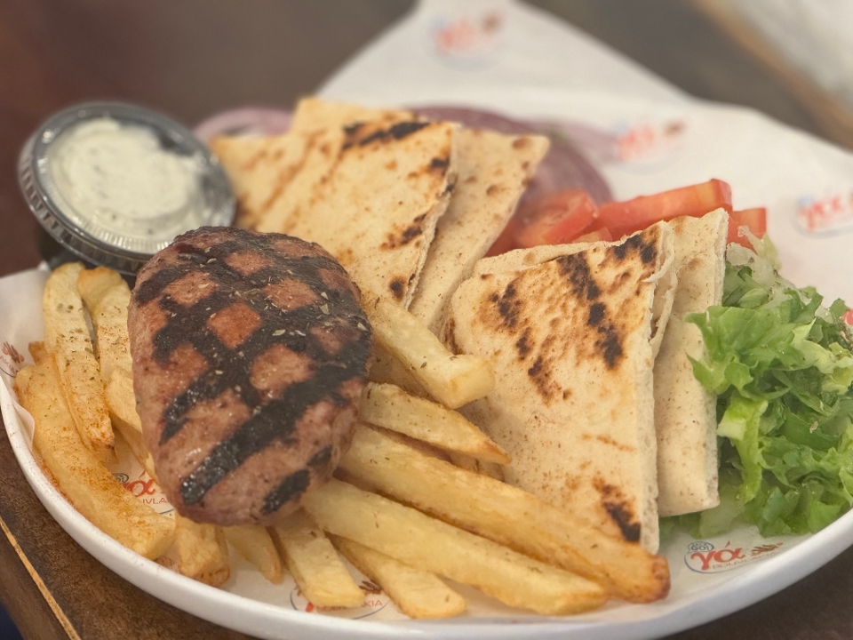 Gyro meat, melted cheese, ya sauce, tomato and onions, inside two Greek pita & fresh fries