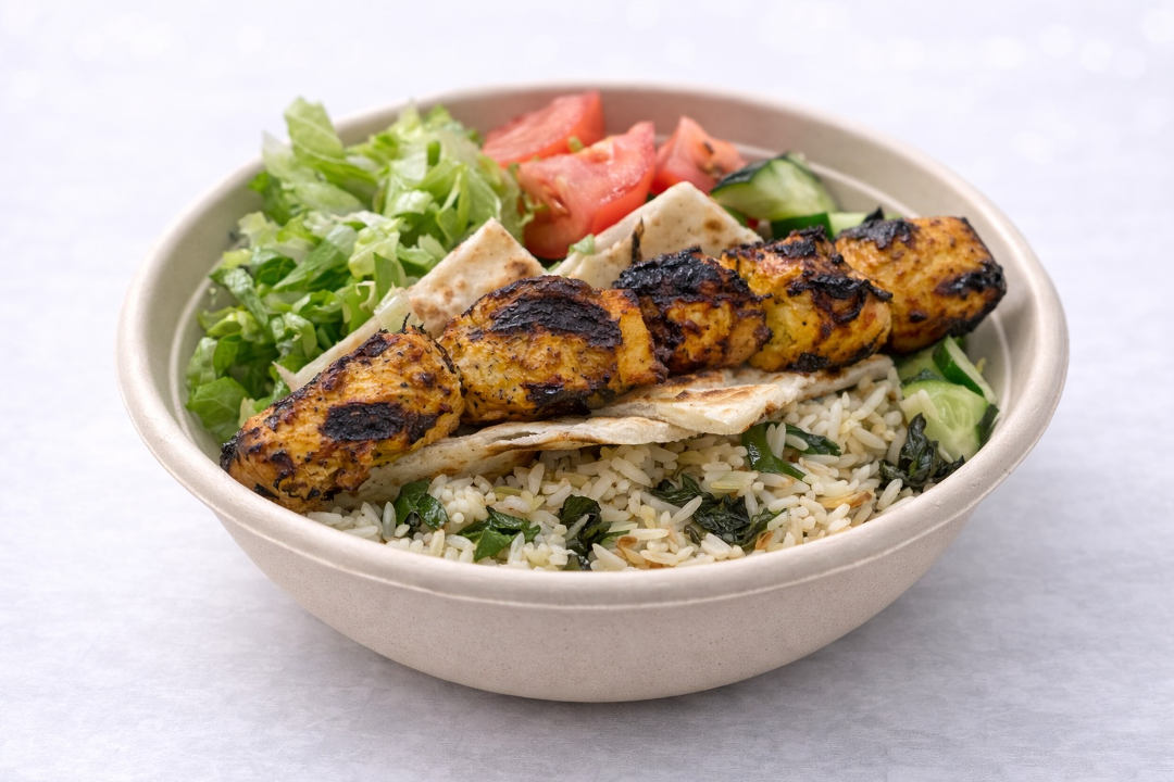 your choice of one: chicken skewer, pork skewer, portobello mushrooms OR veggie skewer over white rice & baby spinach, topped with romaine lettuce, tomatoes, cucumbers & feta. served with your choice of sauce: tzatziki, ya sauce, red sauce or aioli sauce