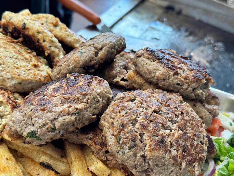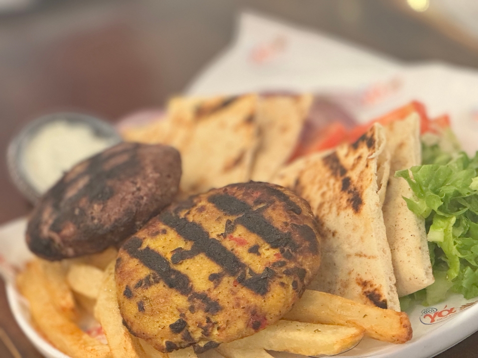 1 beef burgers, 1 chicken burgers, 1 lamb kebabs, 1 loukaniko (sausage), 1 pork souvlakia, 1 chicken souvlakia
