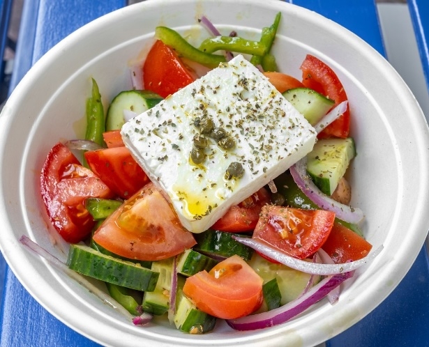 Tomatoes, onions, cucumber, kalamata olives, capers, green peppers, feta cheese, oregano, paksimadi, with extra virgin olive oil and white vinegar