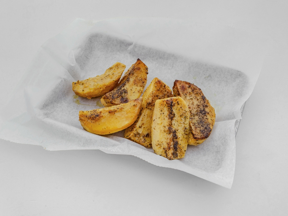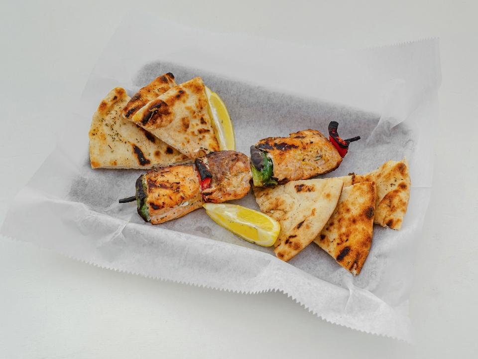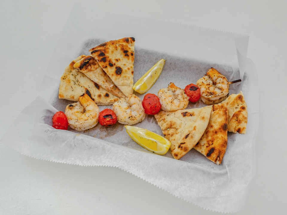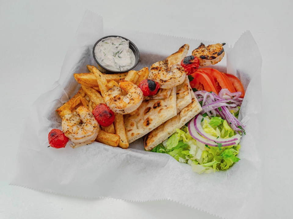 4 shrimp skewers, 4-6 oz. salmon, pita bread, aioli sauce, lemon potatoes and choice of rice
