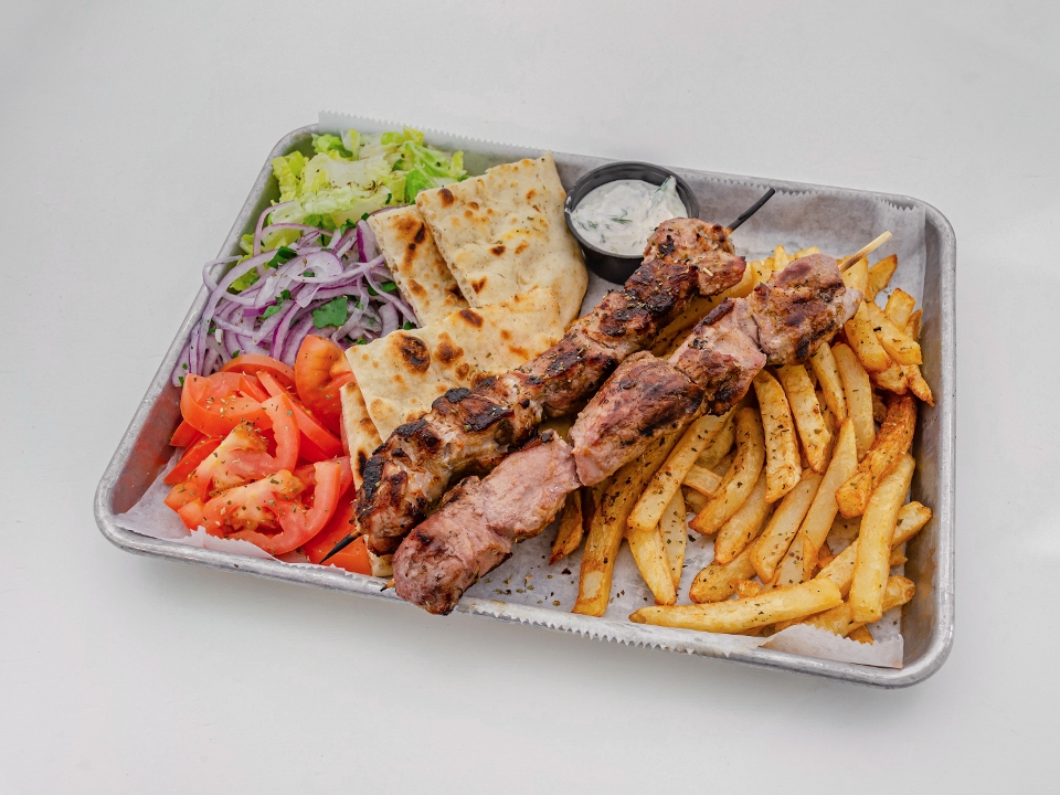 Traditional pork gyro, 2/4 pork skewers, pita bread, tzatziki, tomatoes, onions and fresh fries