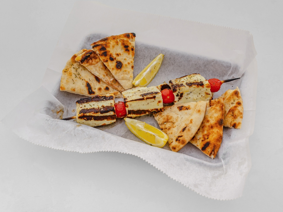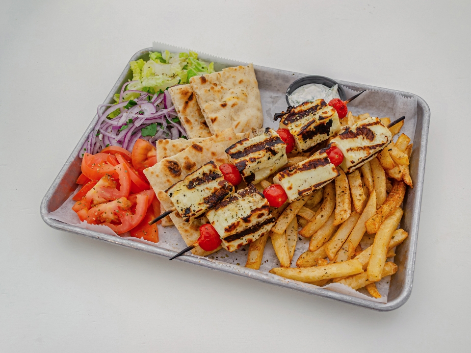 lrg. 2 halloumi souvlakia with fries & aioli sauce sml. 1 halloumi souvlaki with fries & aioli sauce