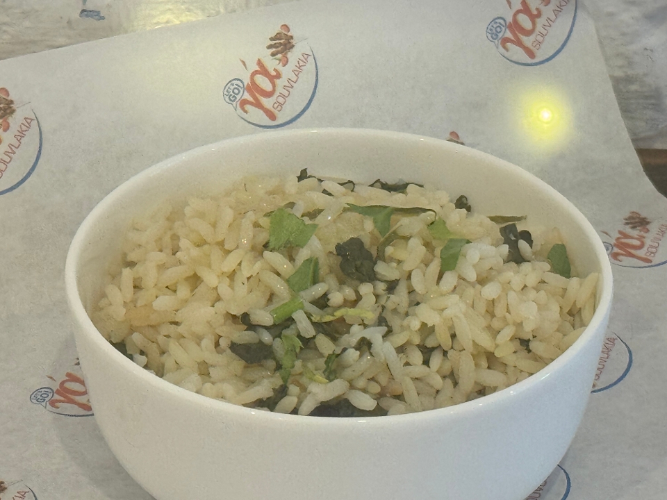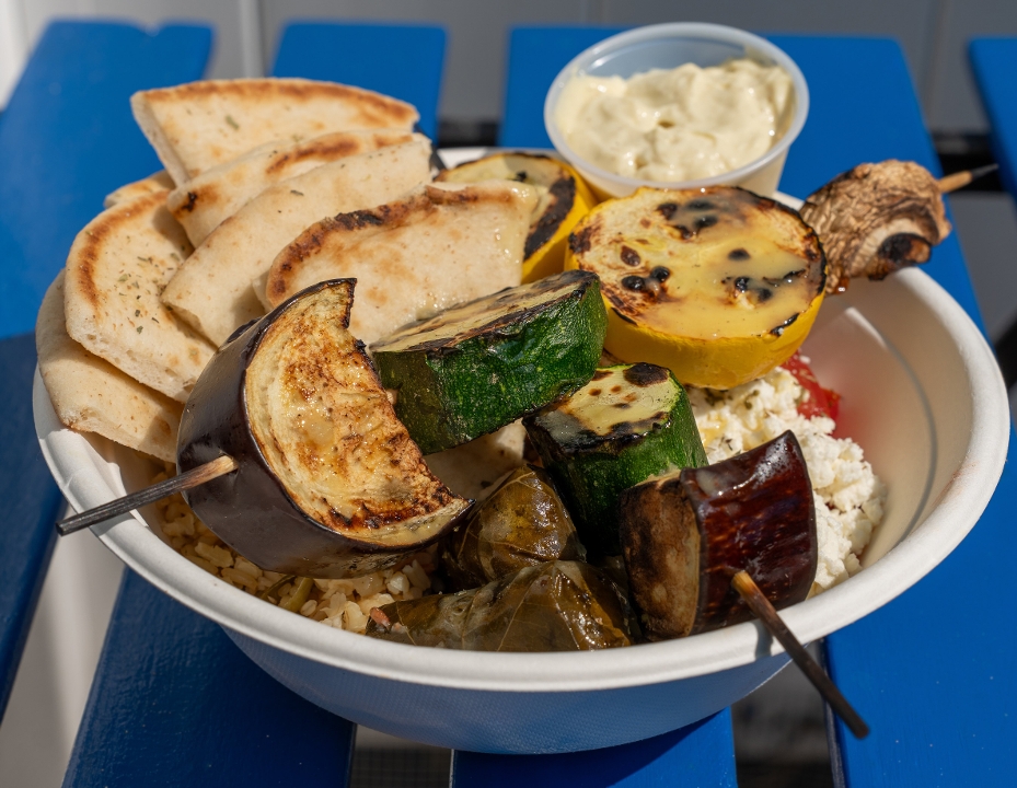 4 veggie souvlakia, 2 halloumi souvlakia, 4 portobello mushroom & choice of rice