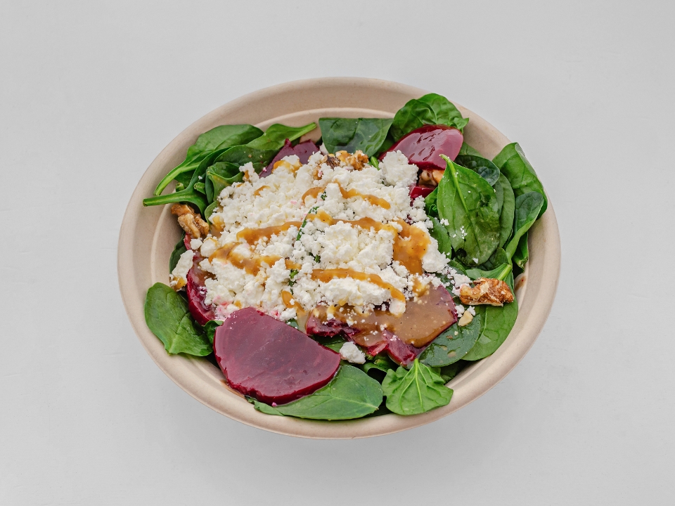 Fresh baby spinach, diced beets, walnuts, feta cheese, honey-olive oil-balsamic vinaigrette