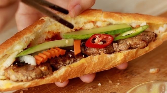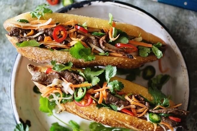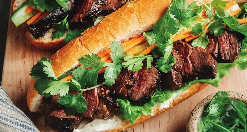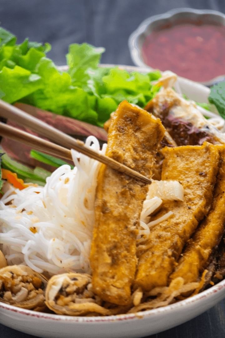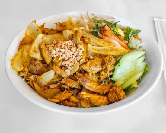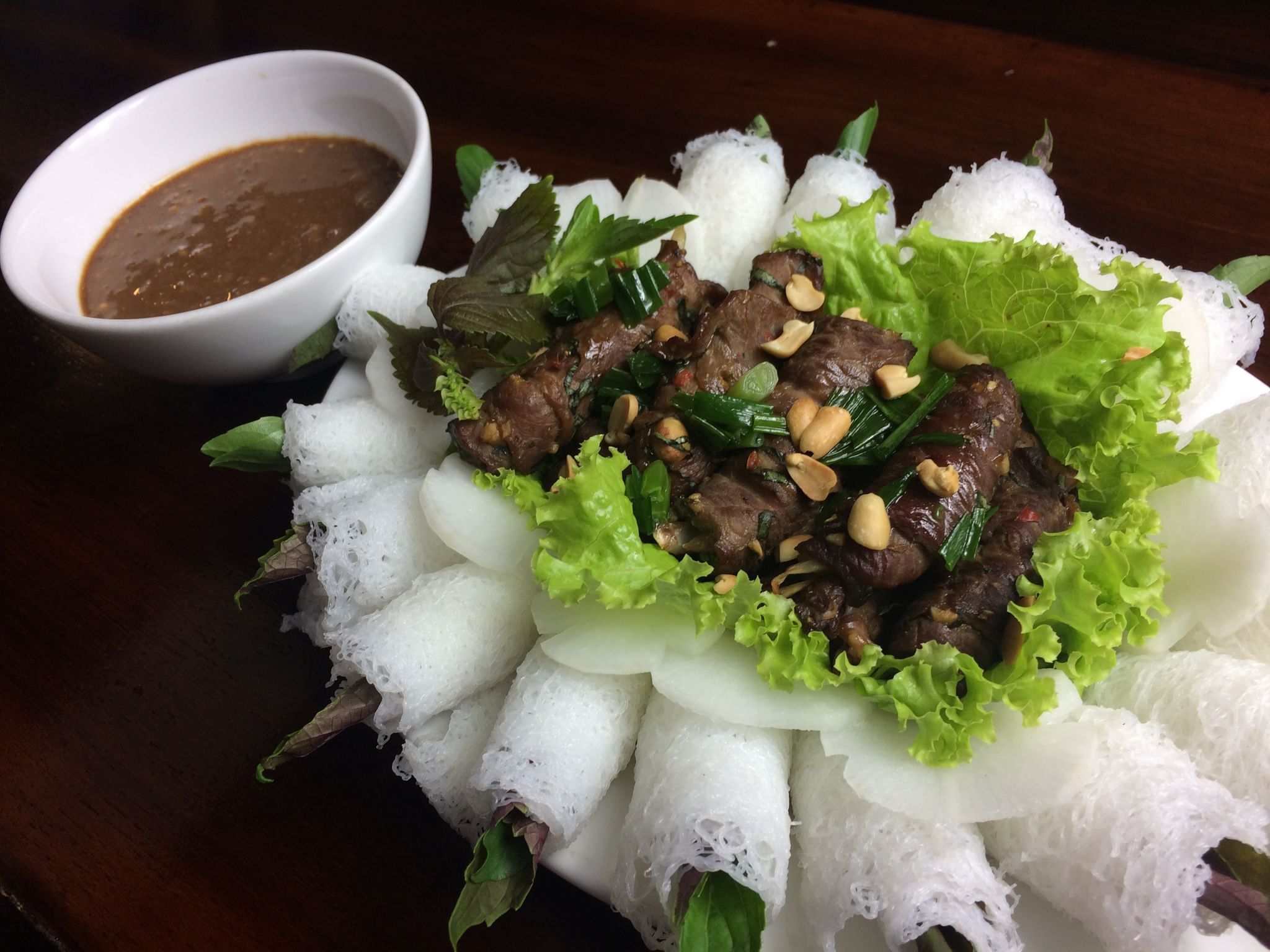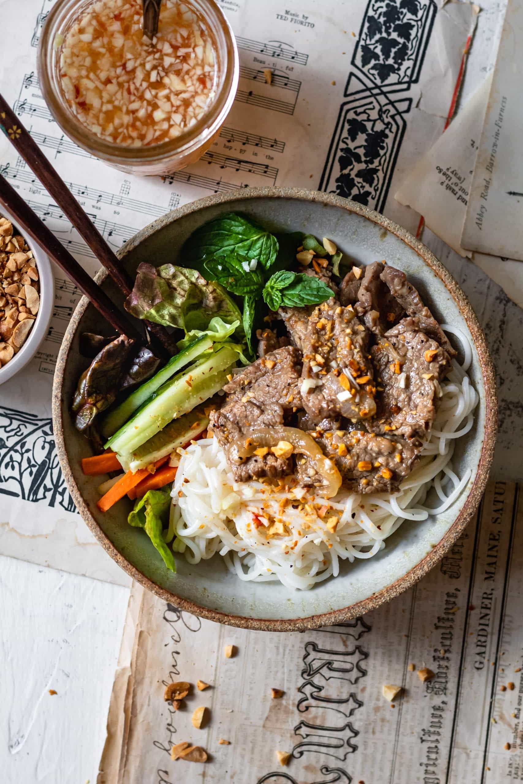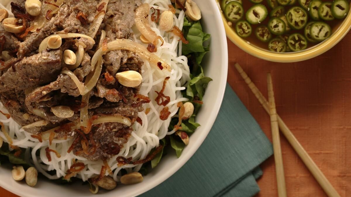VN style triple country flavor grilled beef on tiny rice stick with lettuce, cucumber, and mint leaves