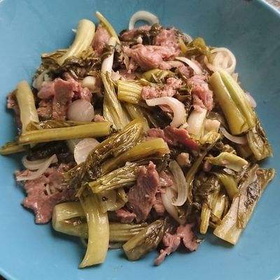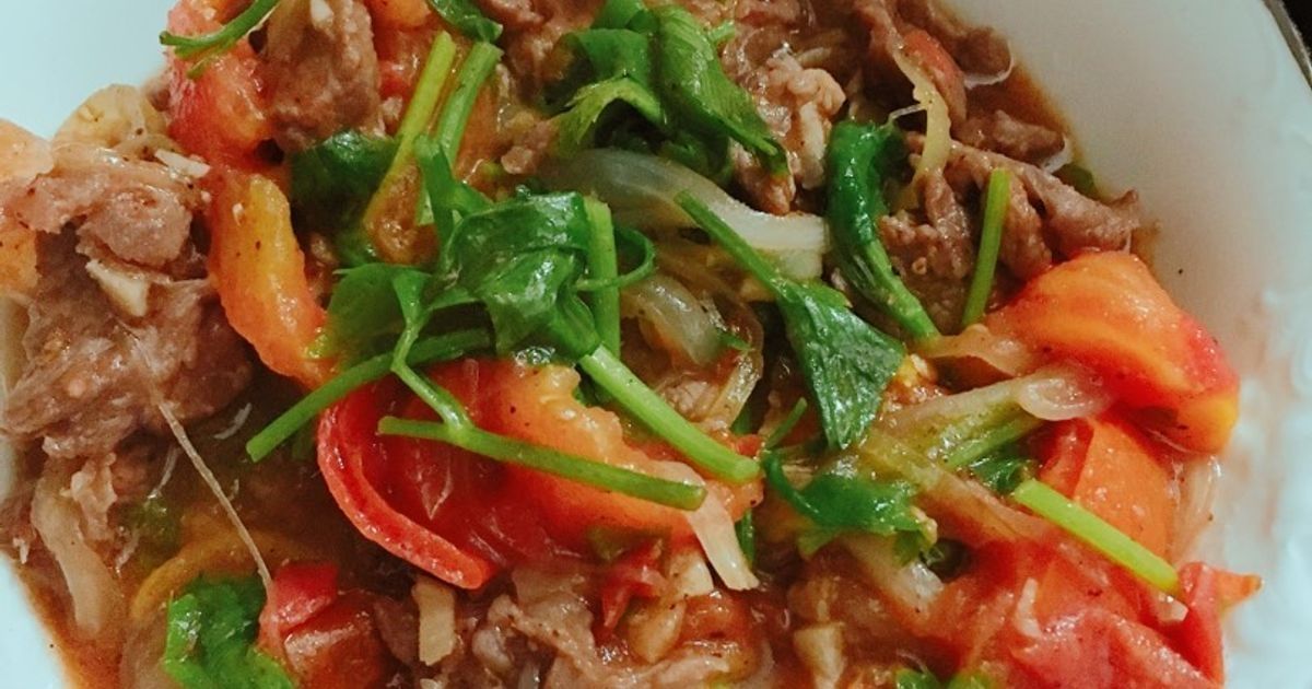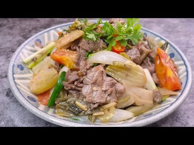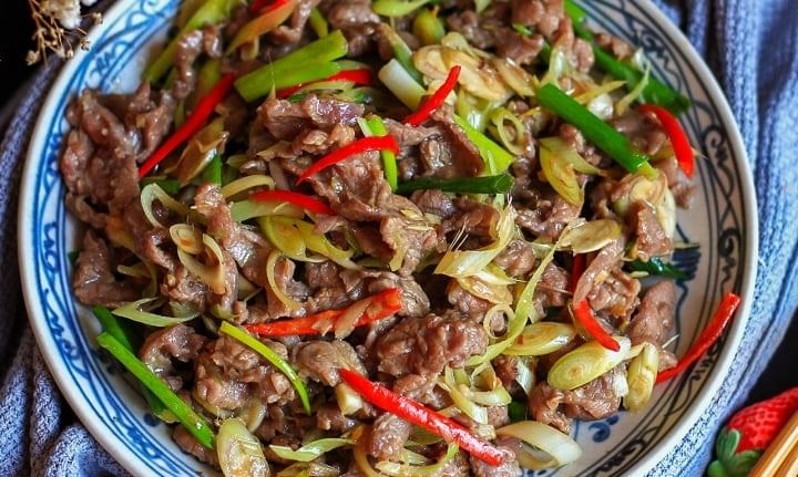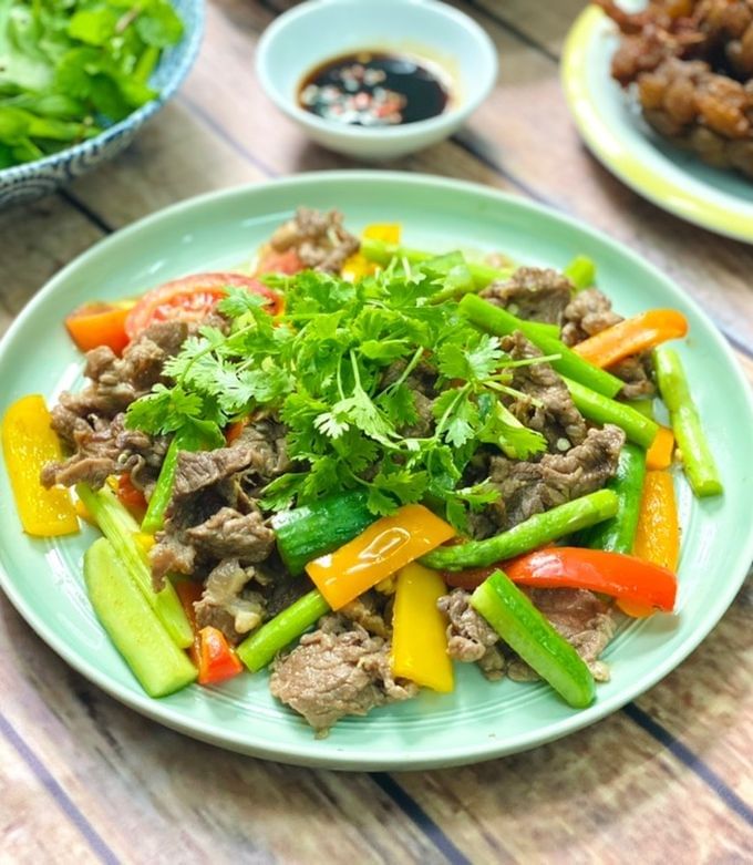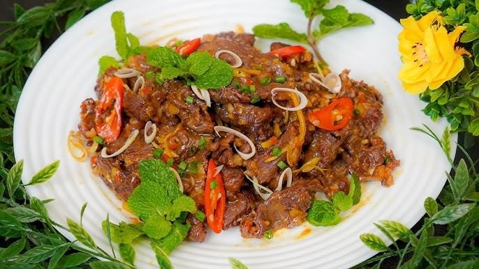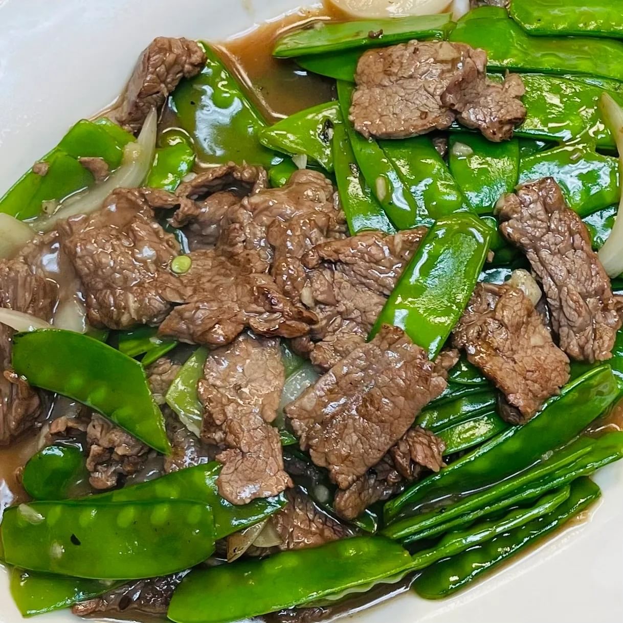 Beef lemongrass, green pepper, onions with chili sauce. Spicy