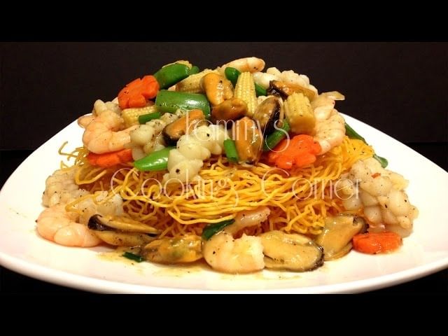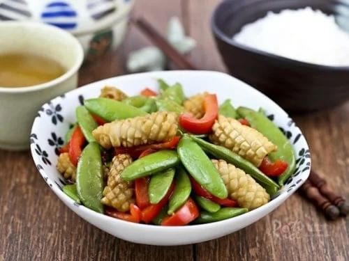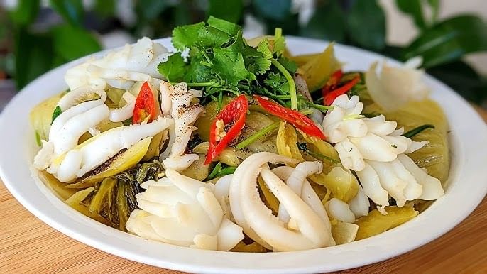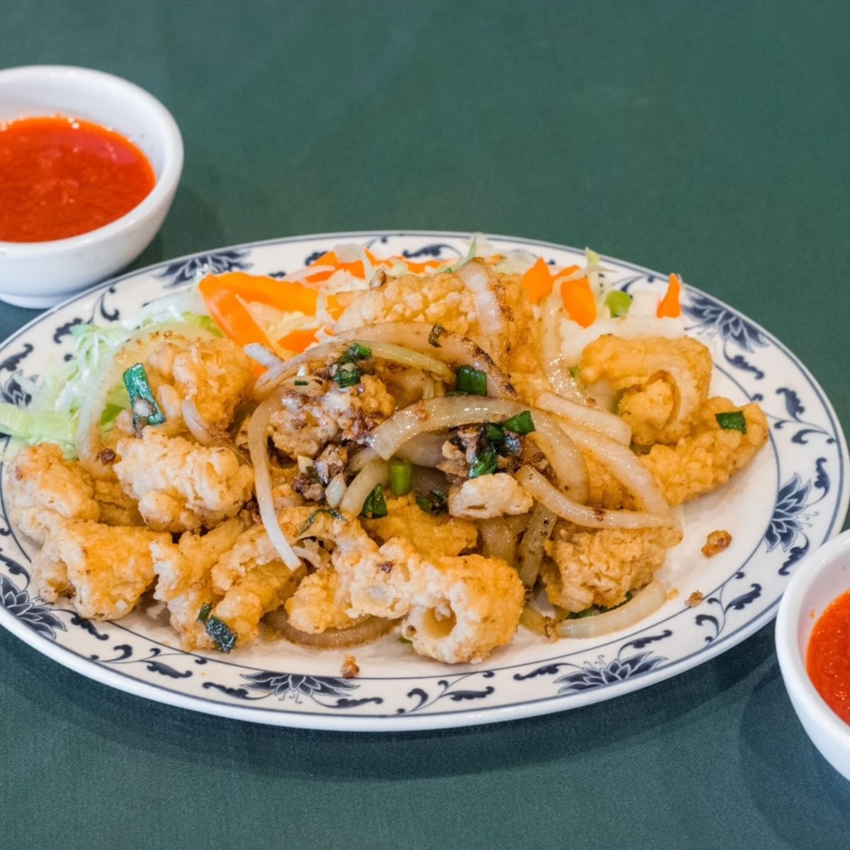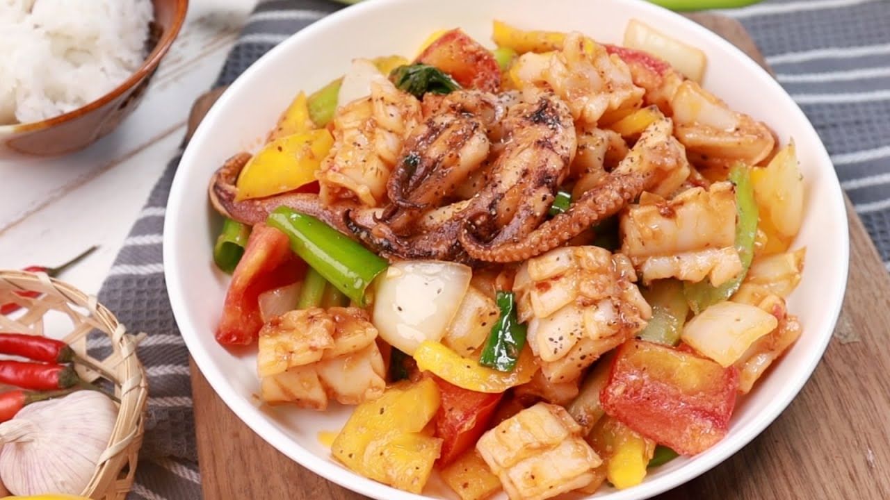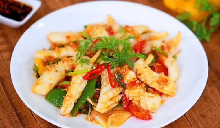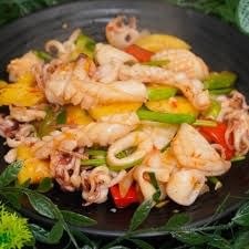 Squid, lemongrass, onions, green peppers, and chili sauce. Spicy