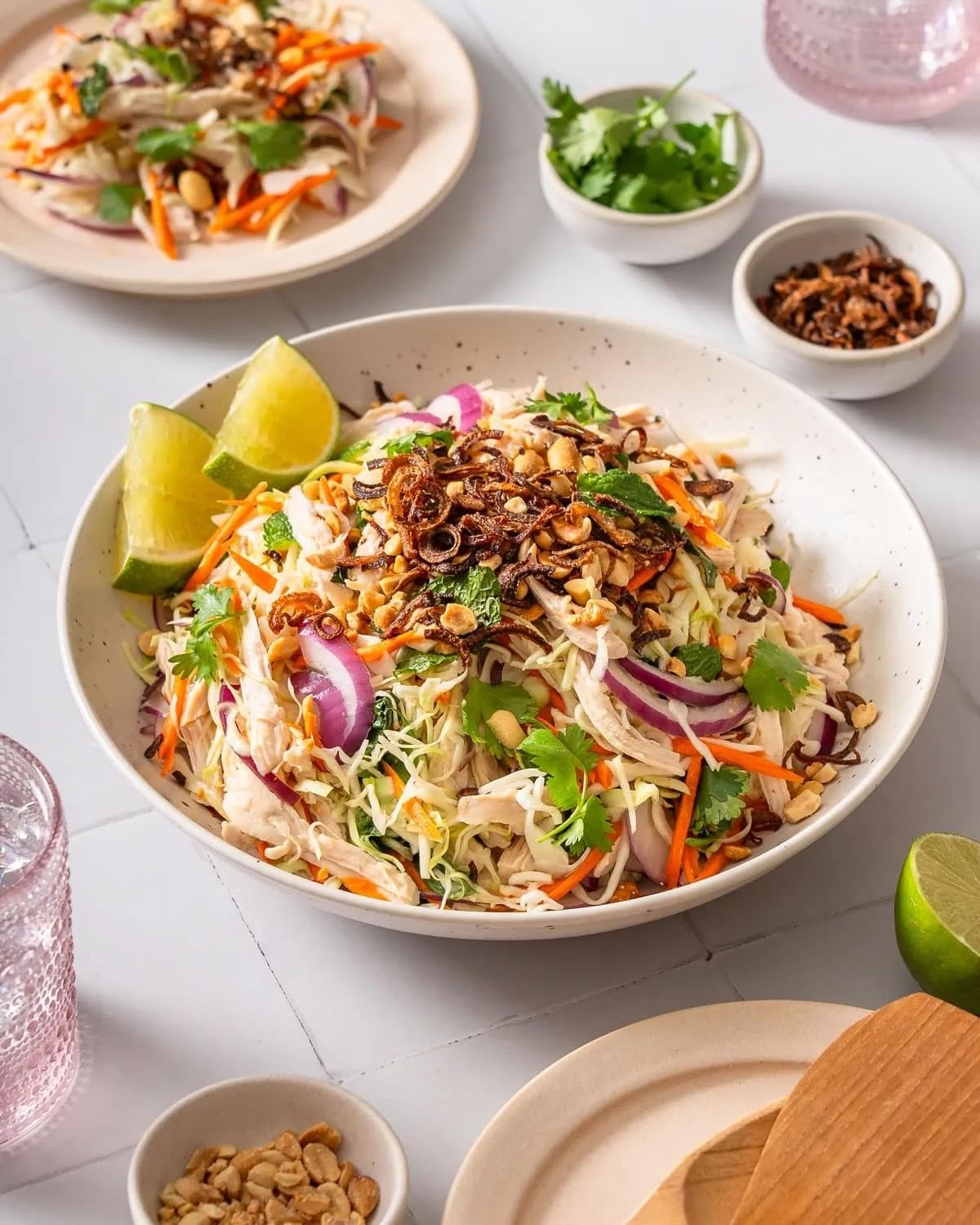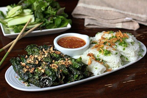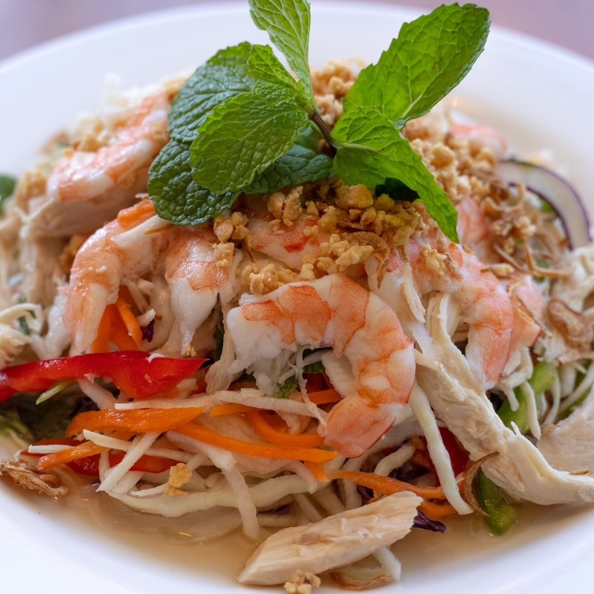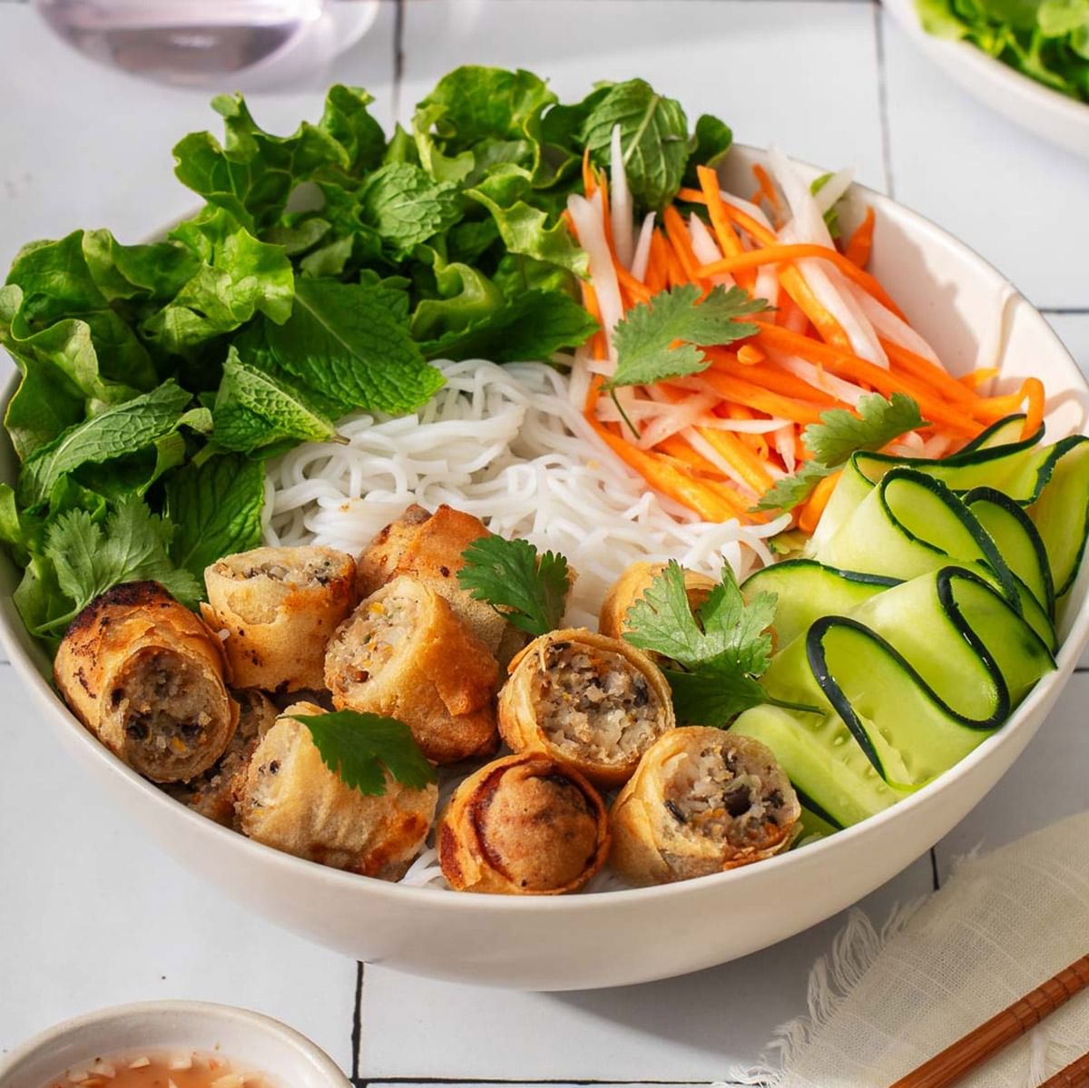 Grilled chicken and Vietnamese spring roll on tiny rice stick with lettuce, cucumber, and mint leaves