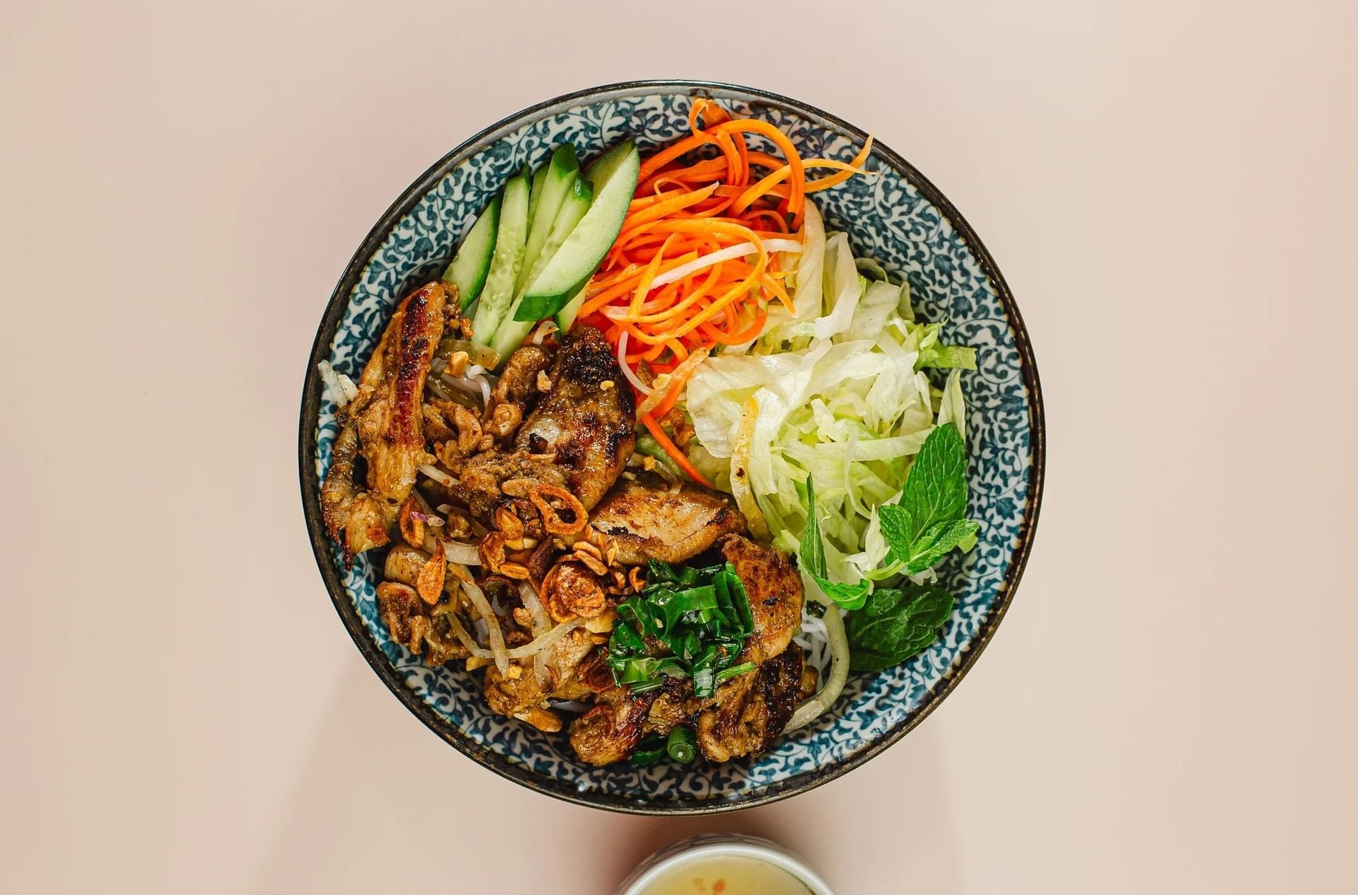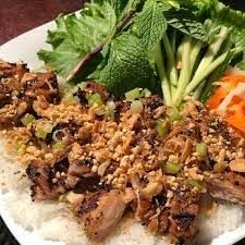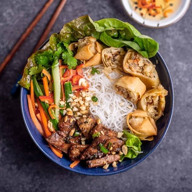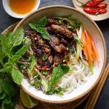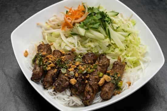 VN style triple country flavor grilled beef on the rice vermicelli lettuce, cucumber, and mint leaves