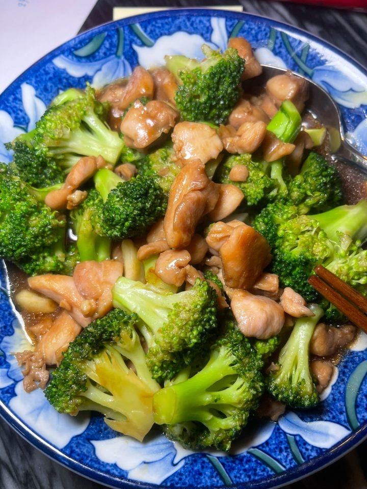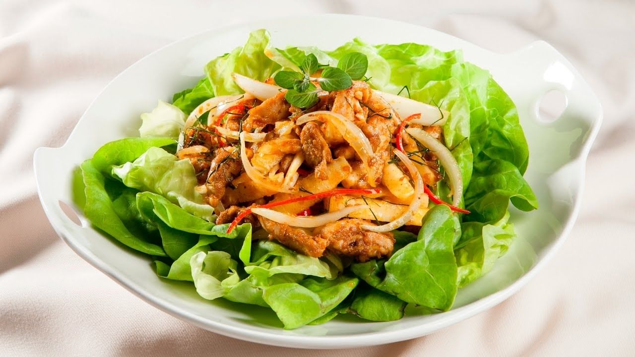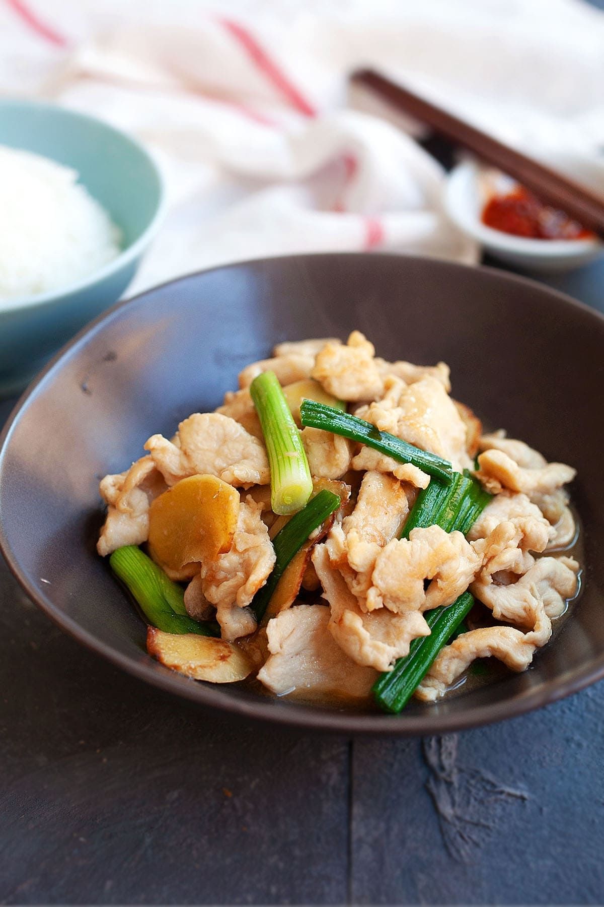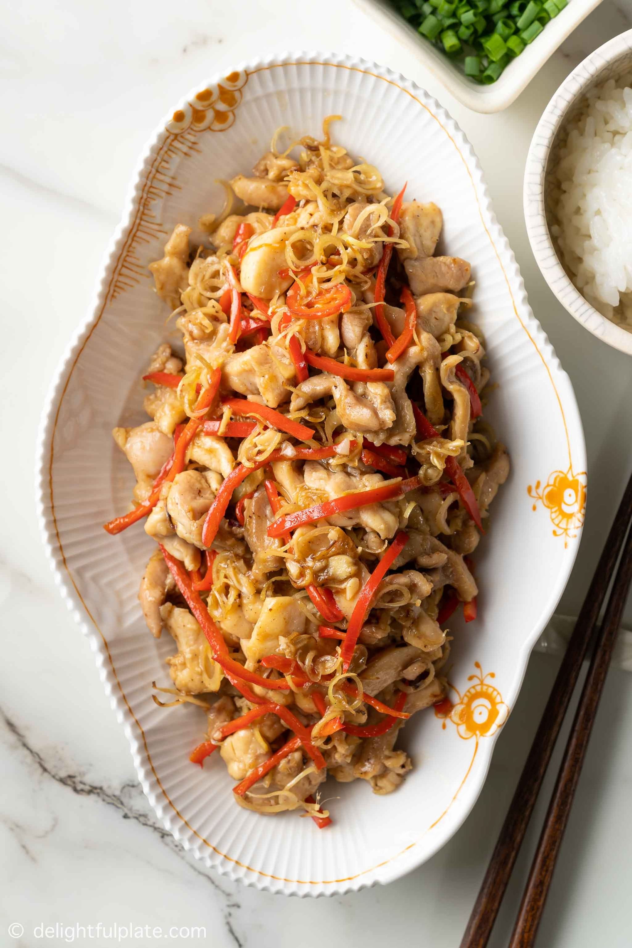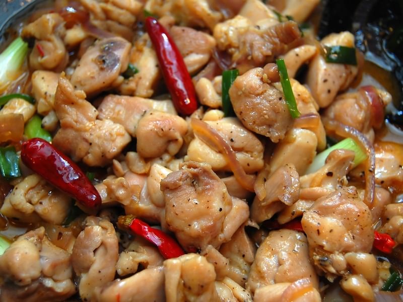 Chicken lemongrass, green pepper, onions with chili sauce. Spicy