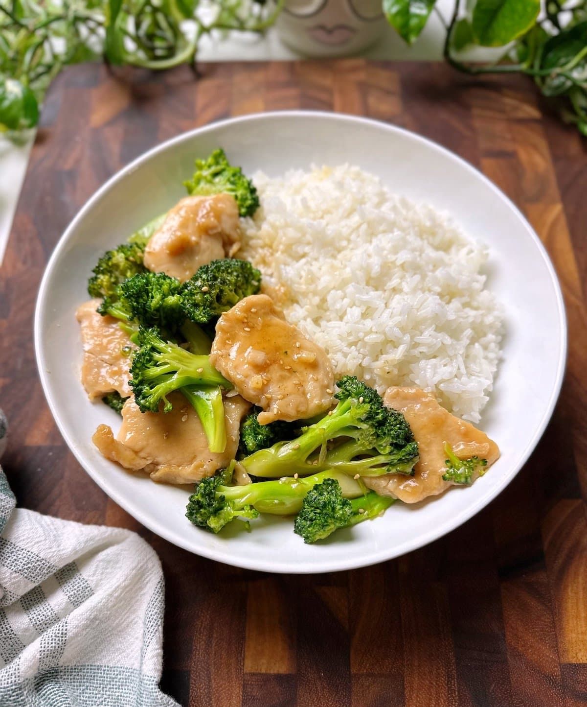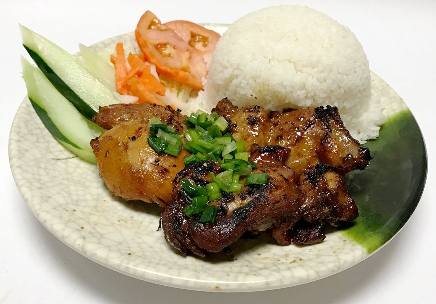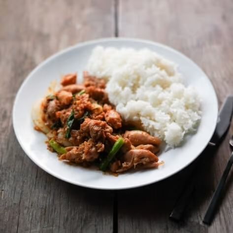 Chicken lemongrass, green pepper, onions on white rice. Spicy