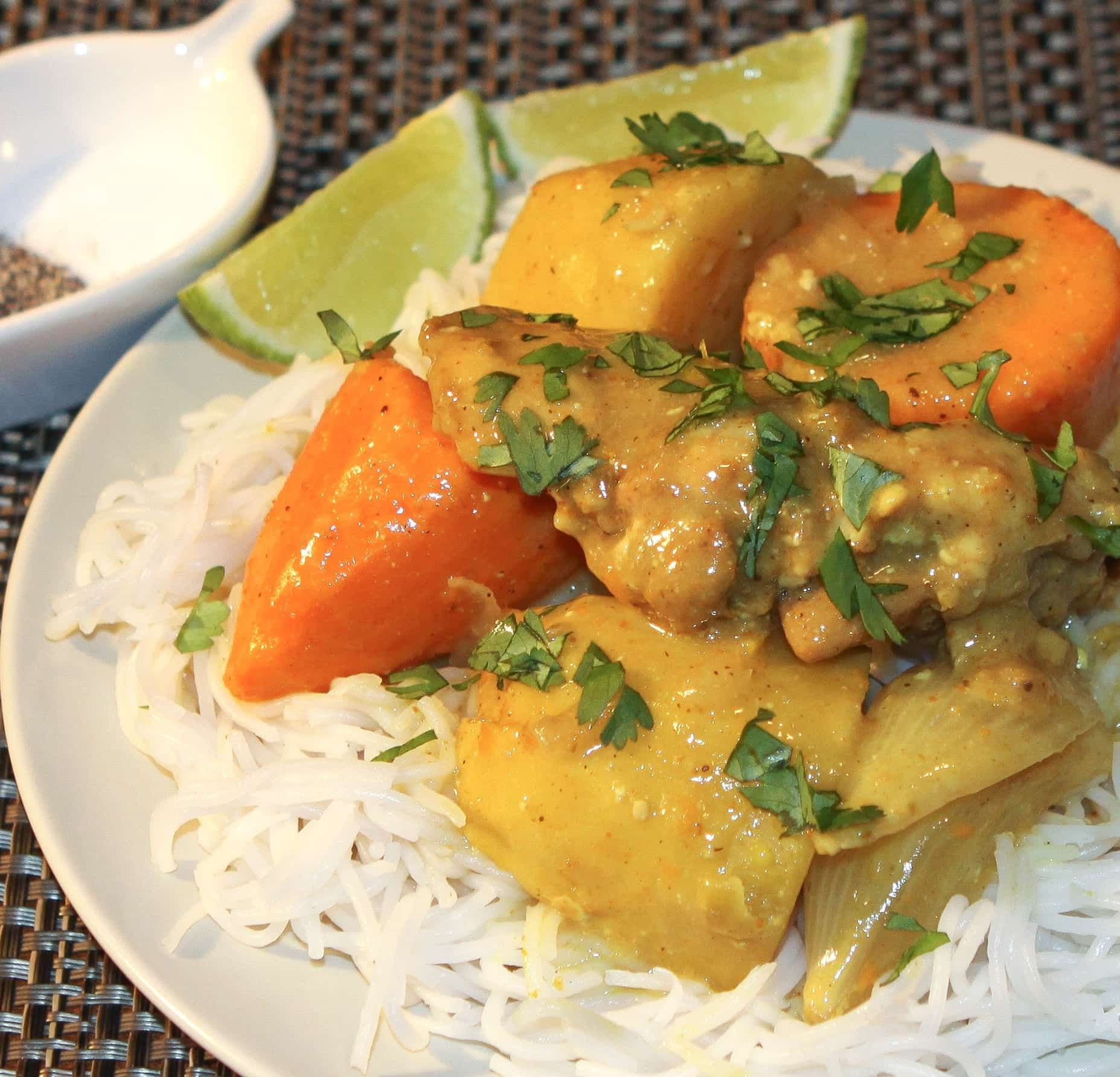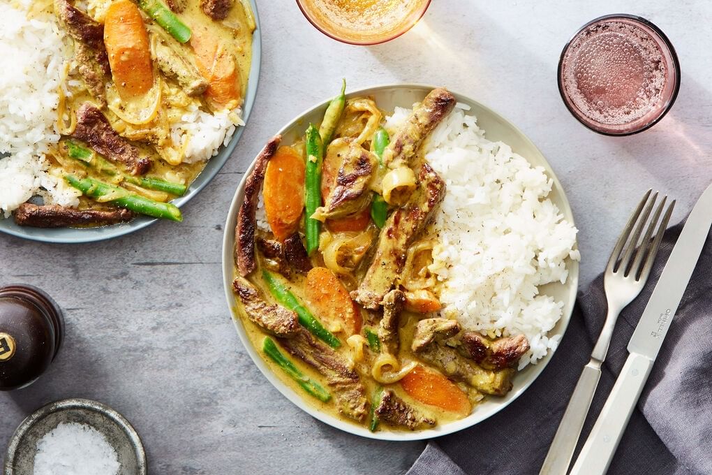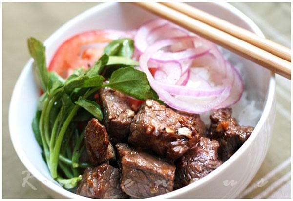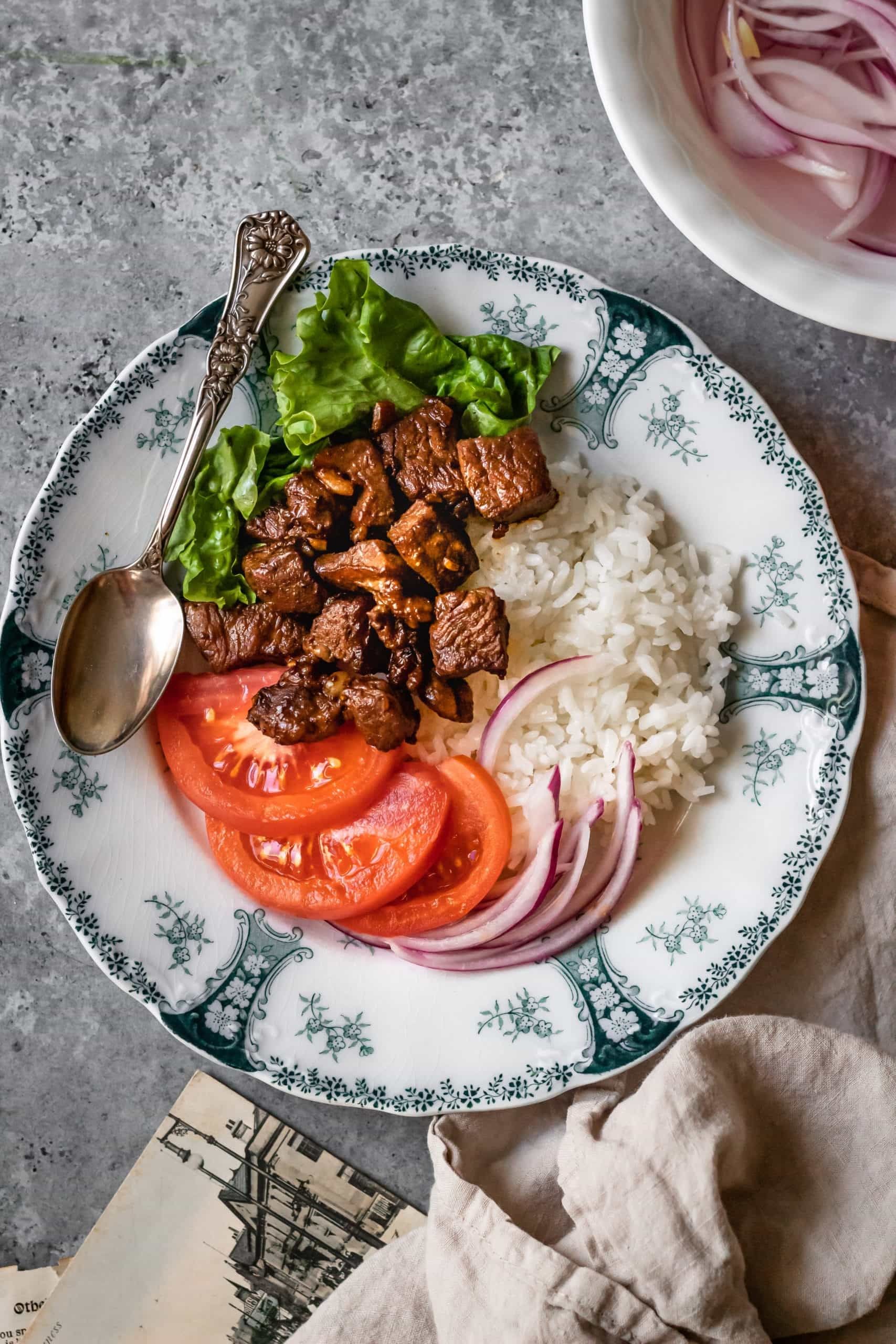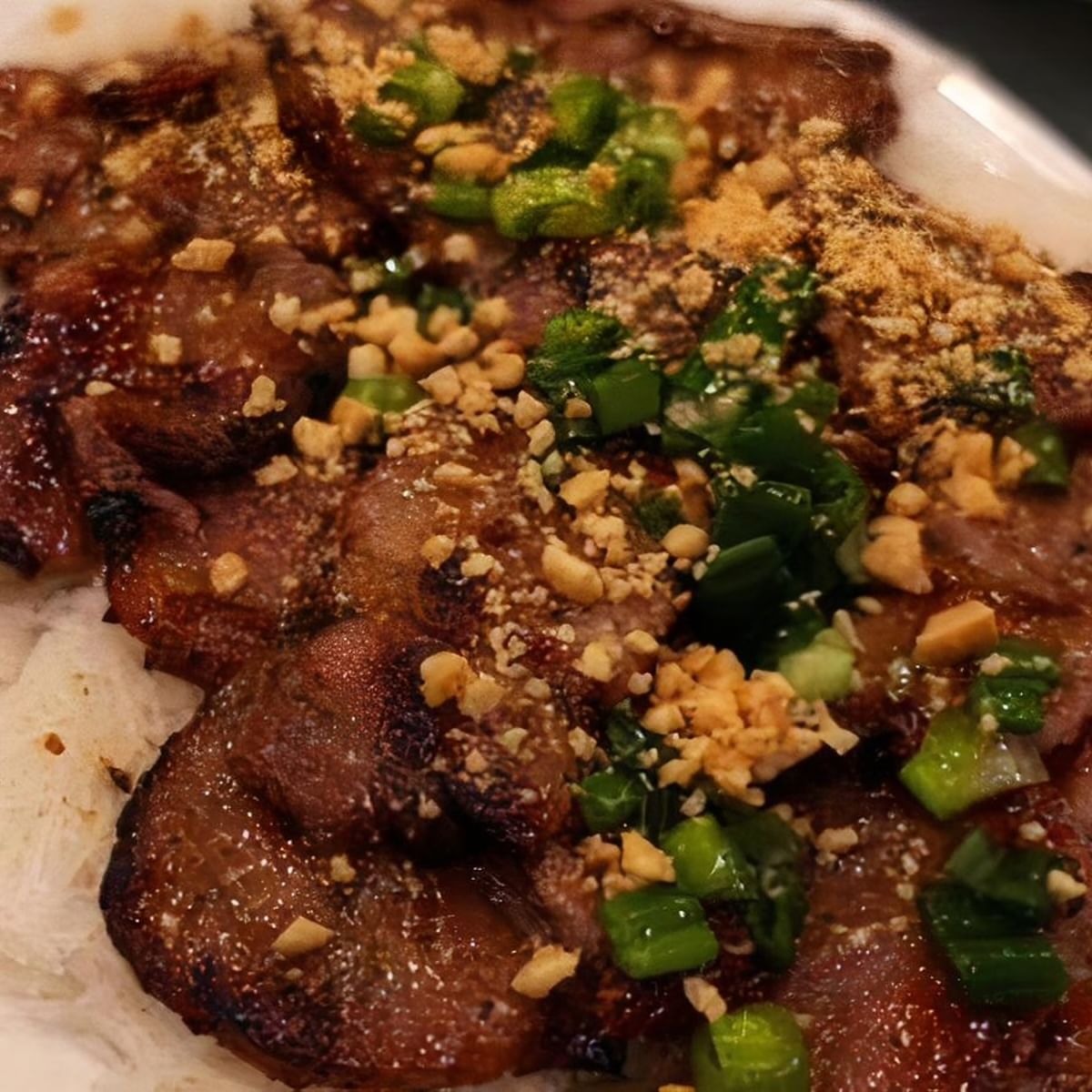Beef, lemongrass, green pepper, onions on white rice. Spicy