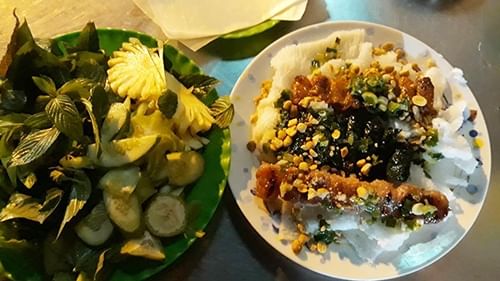 Grilled pork on tiny rice stick with lettuce, cucumber and mint leaves