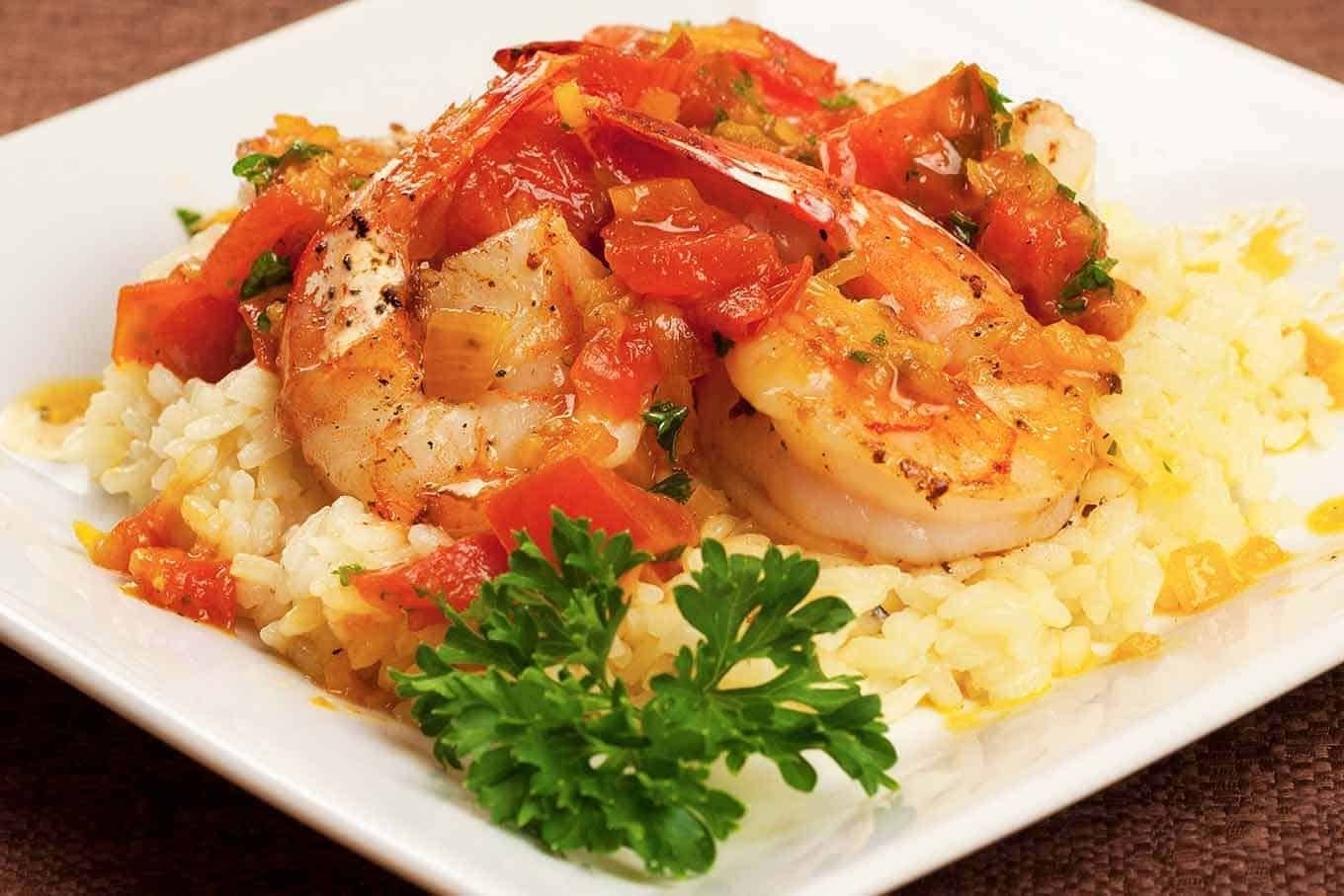 Shrimp dressed with a little salt, served with pepper, onions, and fried butter