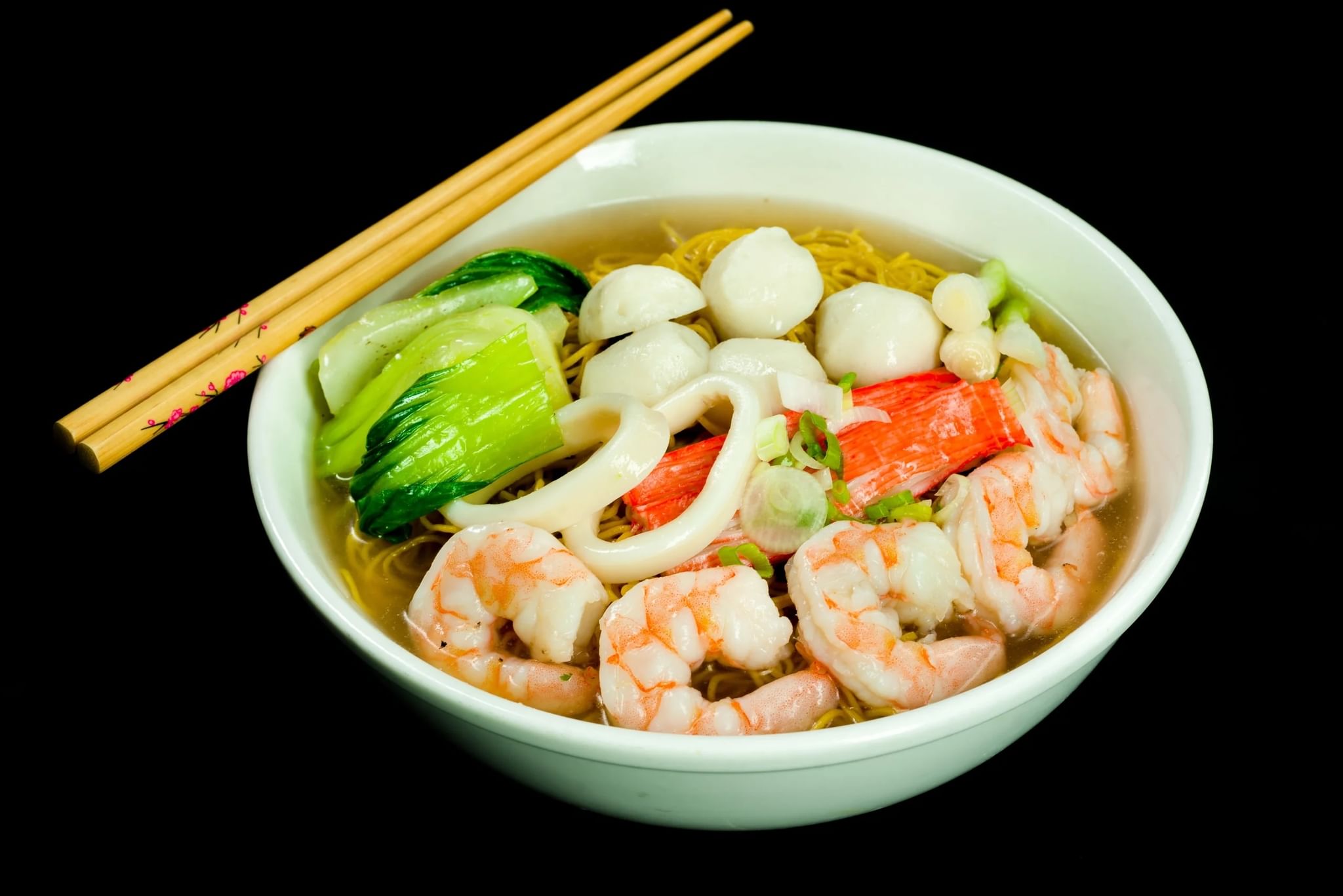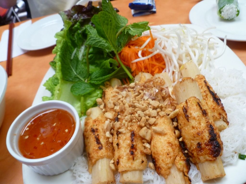 Fried shrimp roll on sugar cane served with vegetables and tiny rice stick