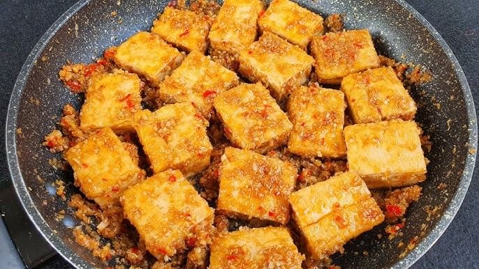 Fried soybean cake with lemongrass, onion, green pepper, and chili sauce. Spicy