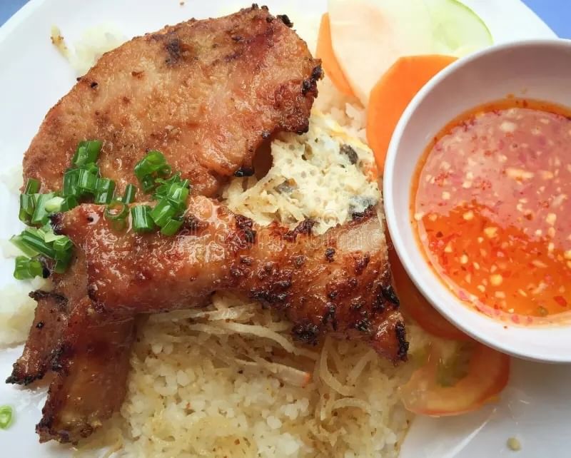 Grilled pork, chop, shredded pork, and crab patty on white rice