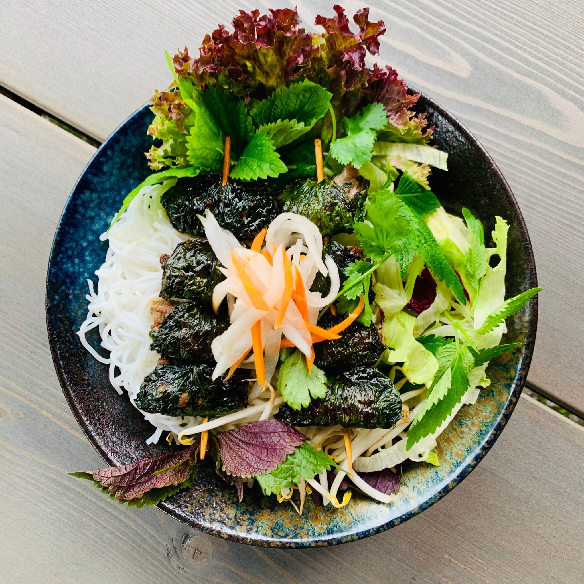 Grilled ground beef wrapped in grape leaves, on rice vermicelli lettuce, cucumber, and mint leaves