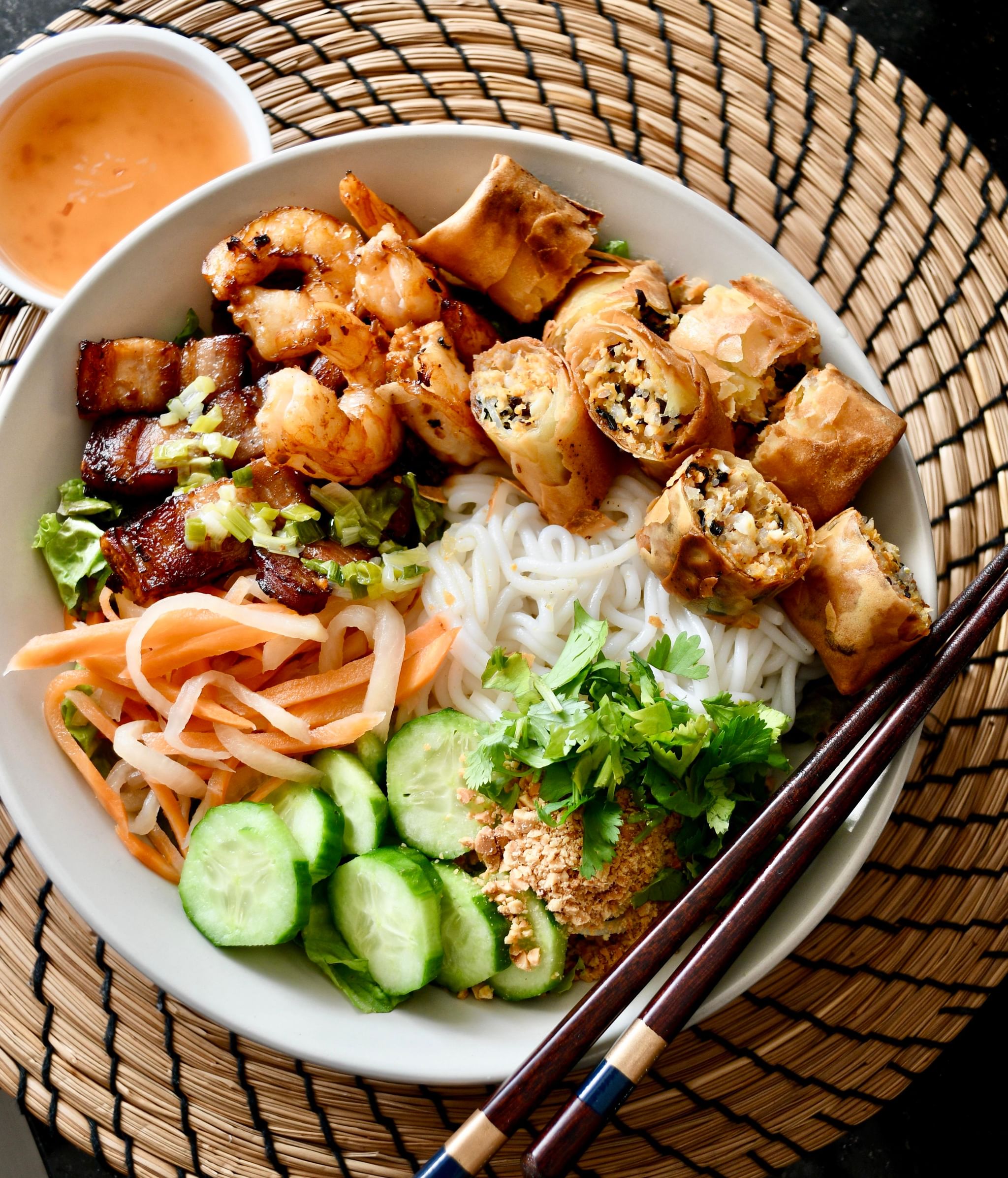 Spring rolls and grilled pork with lettuce on rice vermicelli
