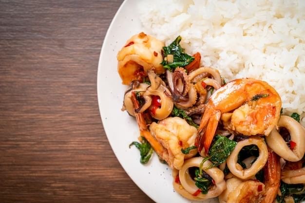 Squid lemongrass, green pepper, onions on white rice. Spicy
