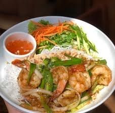 Spring roll and grilled shrimp with lettuce on rice vermicelli