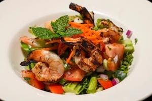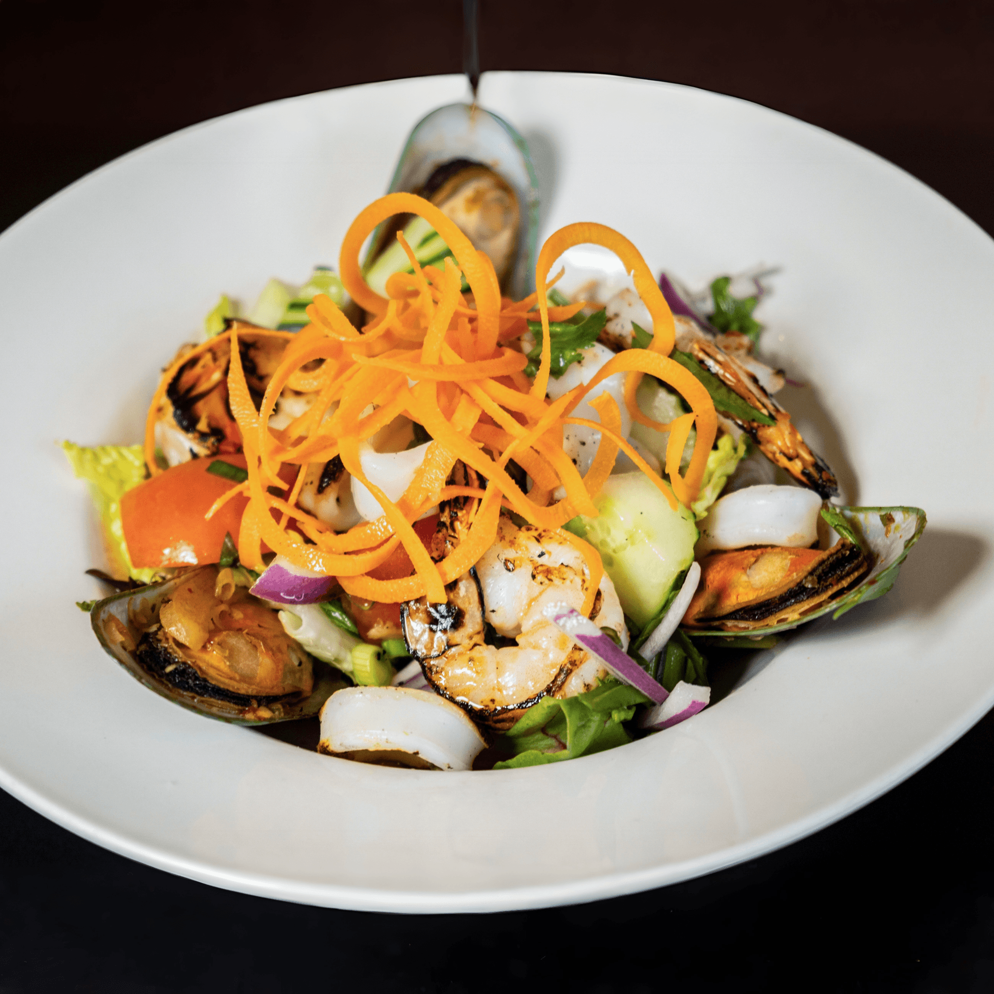 Shrimp, scallops, squid and mussels tossed with red onions, cucumber, tomatoes, lime juice, fish sauce and ground chili peppers. served on a bed of lettuce