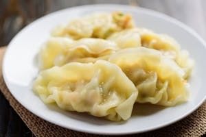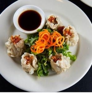 5 pieces. pork and shrimp dumplings with soy sauce vinaigrette