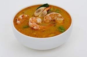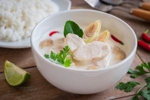 Chicken or shrimp with mushrooms, in a galanga-lime juice coconut broth