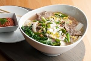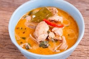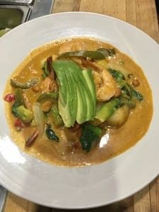 Coconut milk, bamboo shoots, mixed vegetables, basil leaves, and chili pepper. served with white rice and your choice of soup or salad