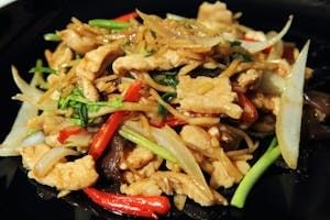 Ground chicken and shrimp sauteed with basil, onions, scallion, bell pepper and chili peppers