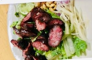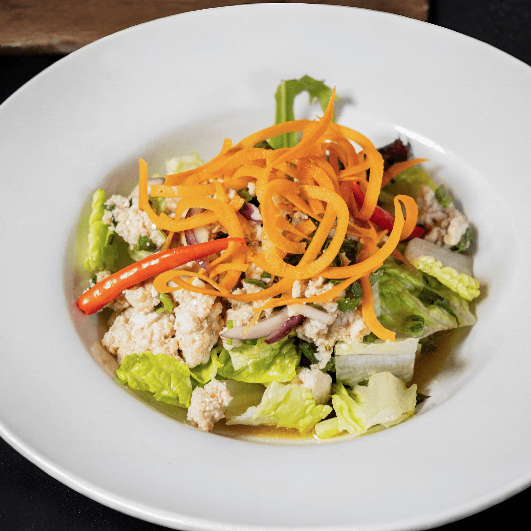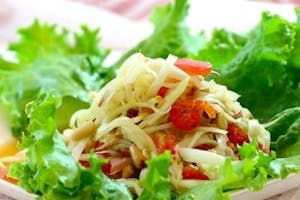Tossed with red onions, cucumber, tomatoes, lime juice, fish sauce and ground chili peppers served on a bed of lettuce