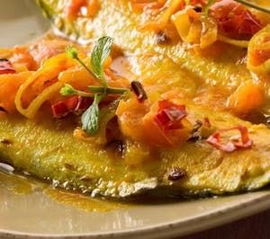 Steamed fish in thai herbs with basil and chili peppers wrapped in a banana leaf